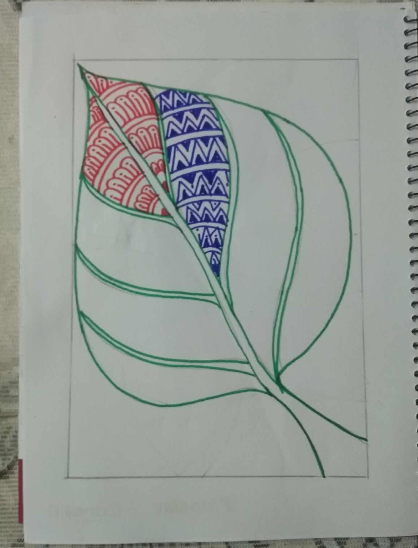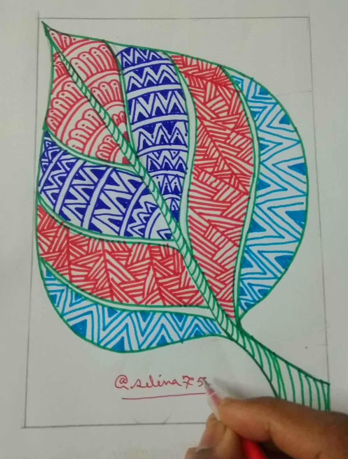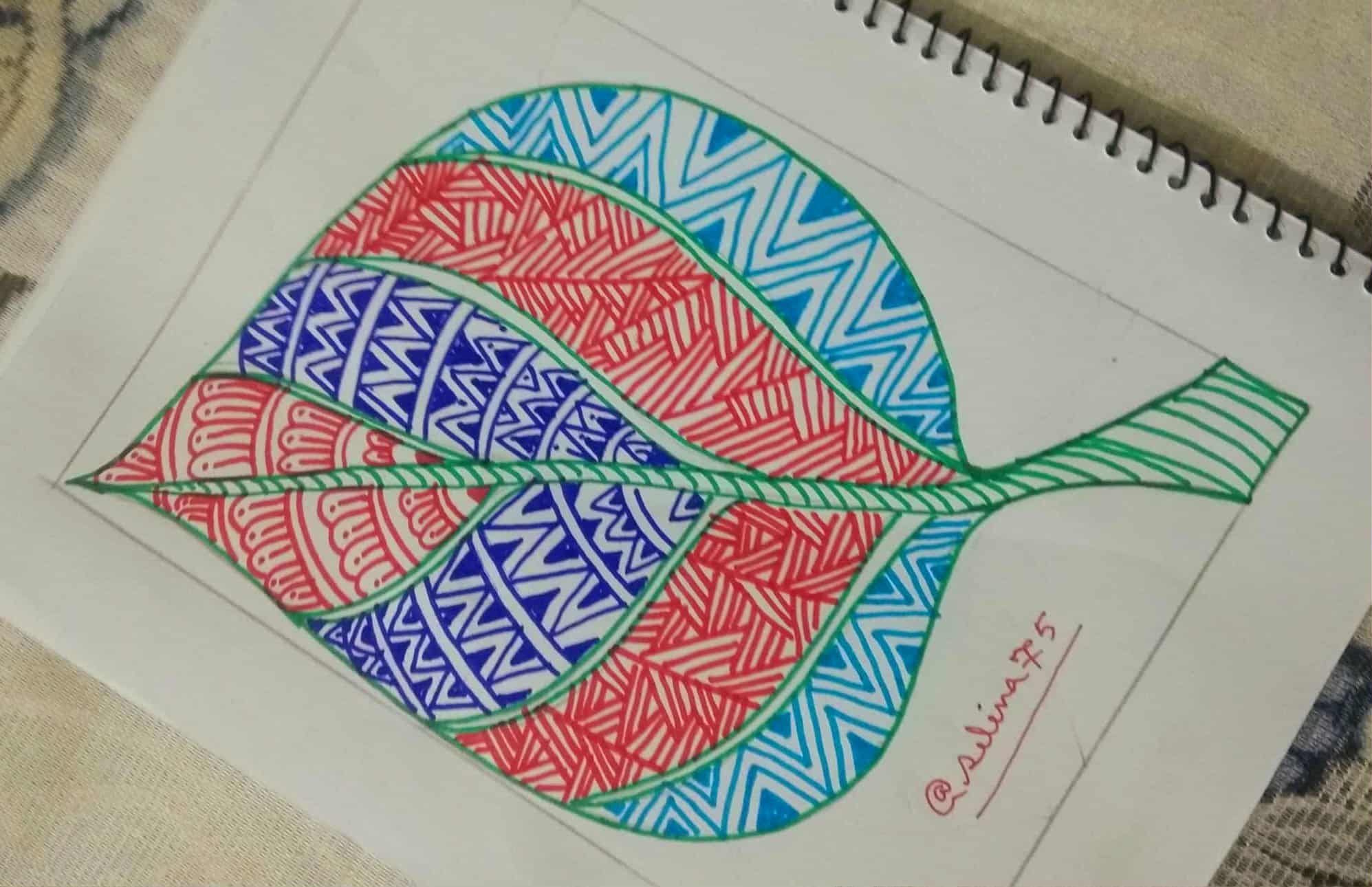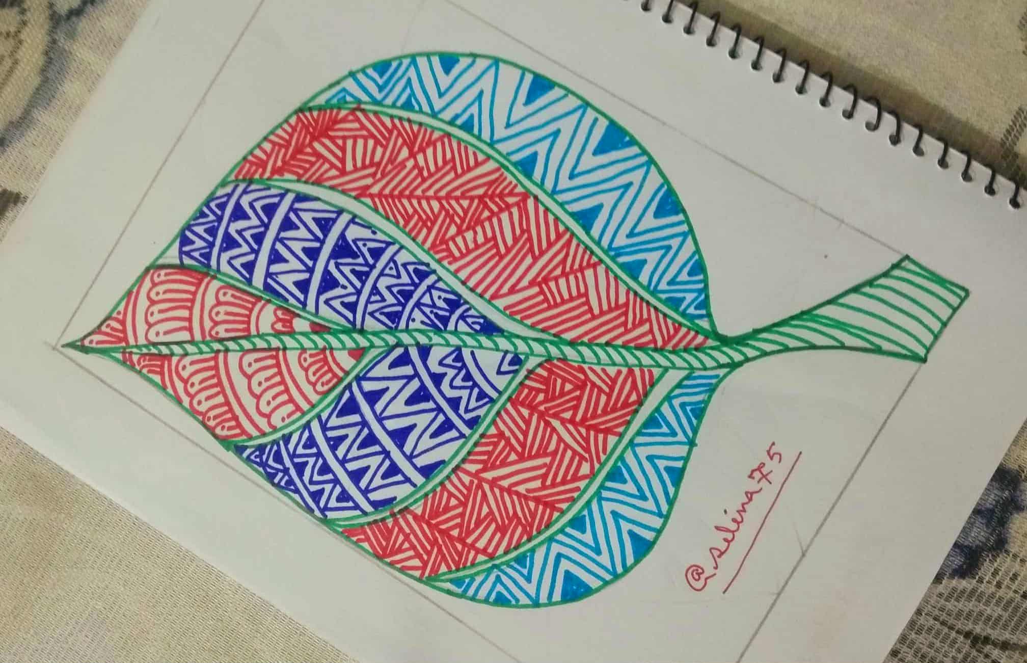 সবুজ সাইন পেন দিয়ে পাতার অন্য অংশে ডিজাইন একে ভরাট করে নিয়েছি।