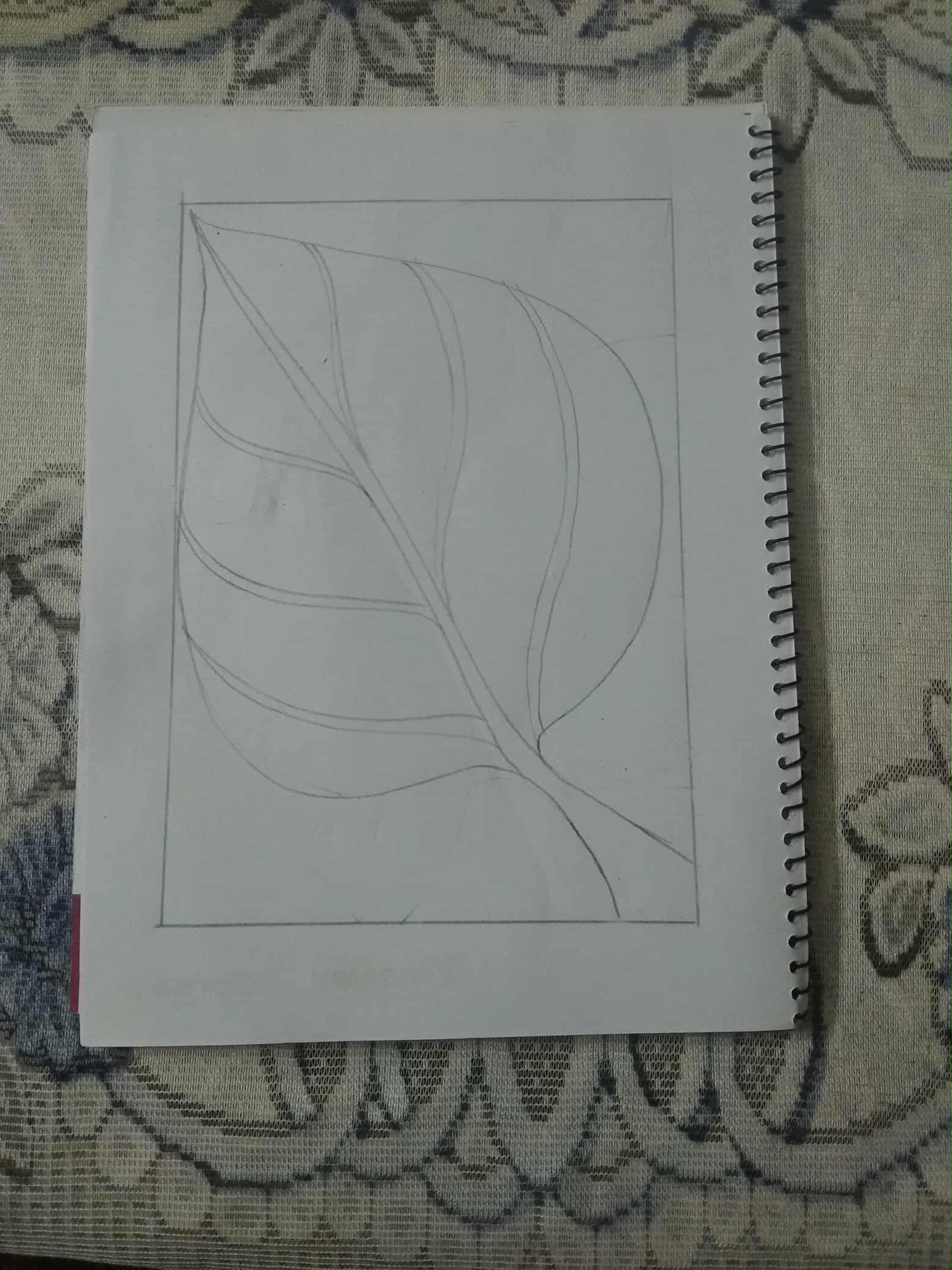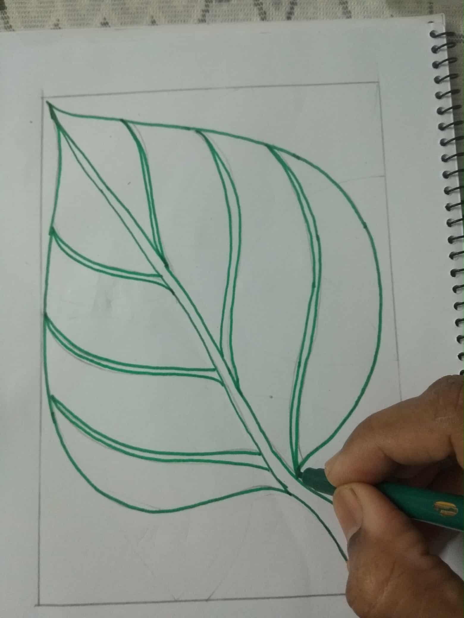 প্রথমে সাদা কাগজের চারপাশে দাগ দিয়ে নিয়েছি।দাগের ভিতর একটি পাতা একে নিয়েছি পেন্সিল দিয়ে।পাতাটিকে বিভিন্ন অংশে ভাগ করে নিয়েছি।
