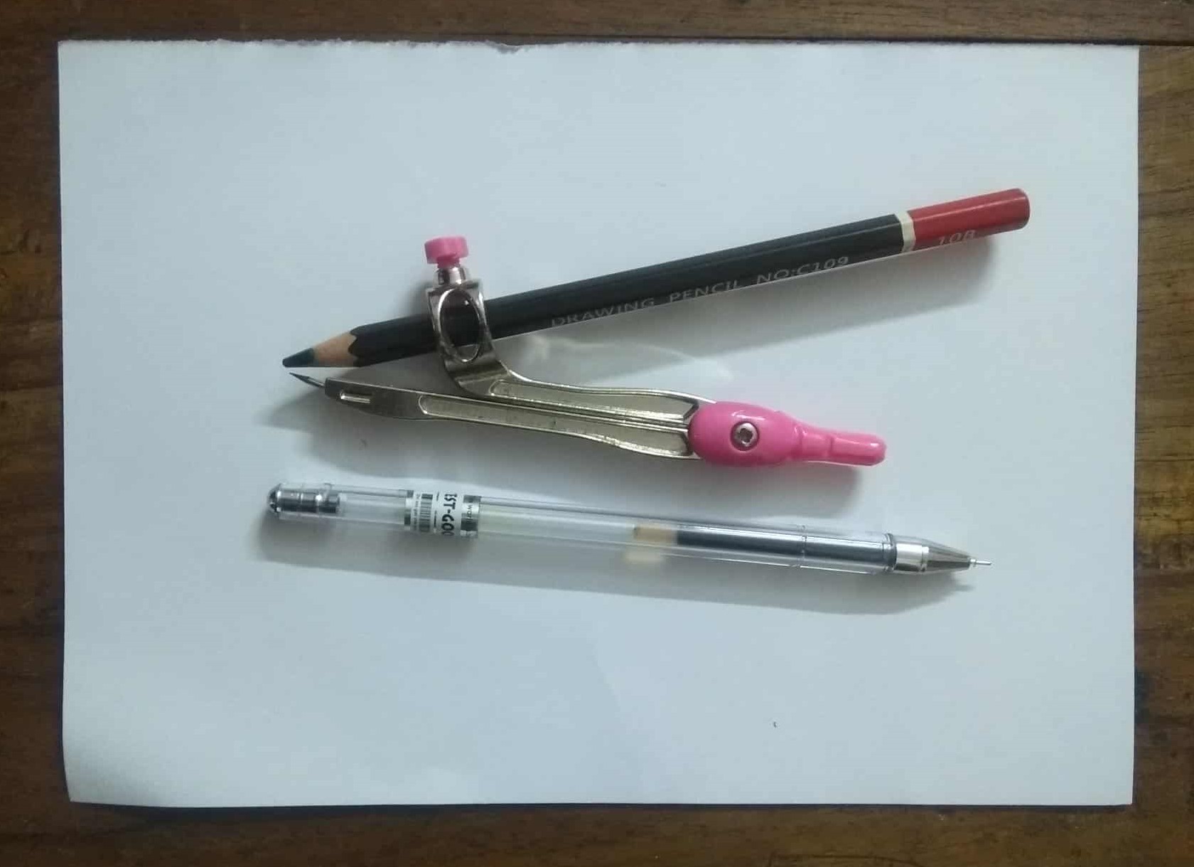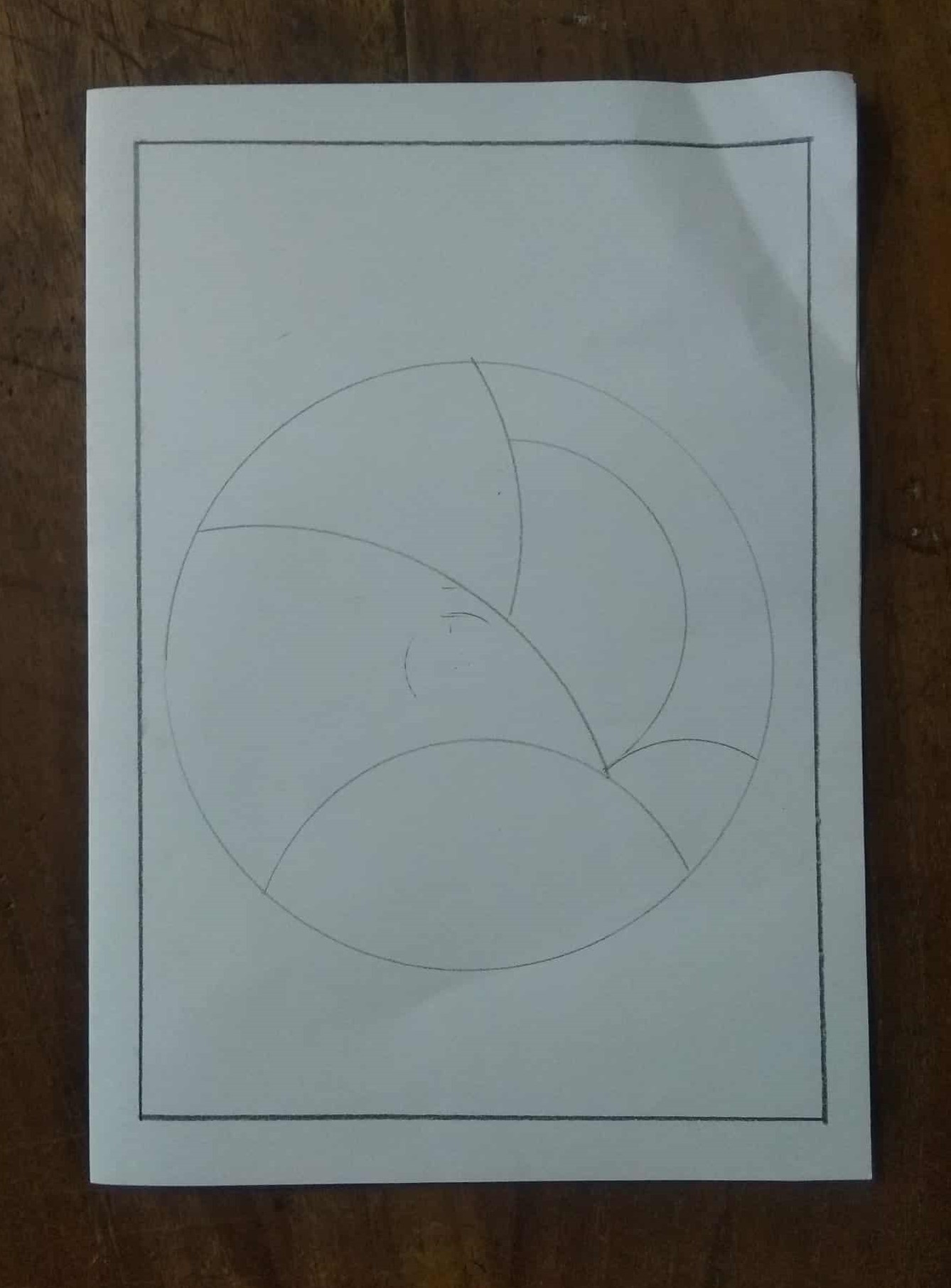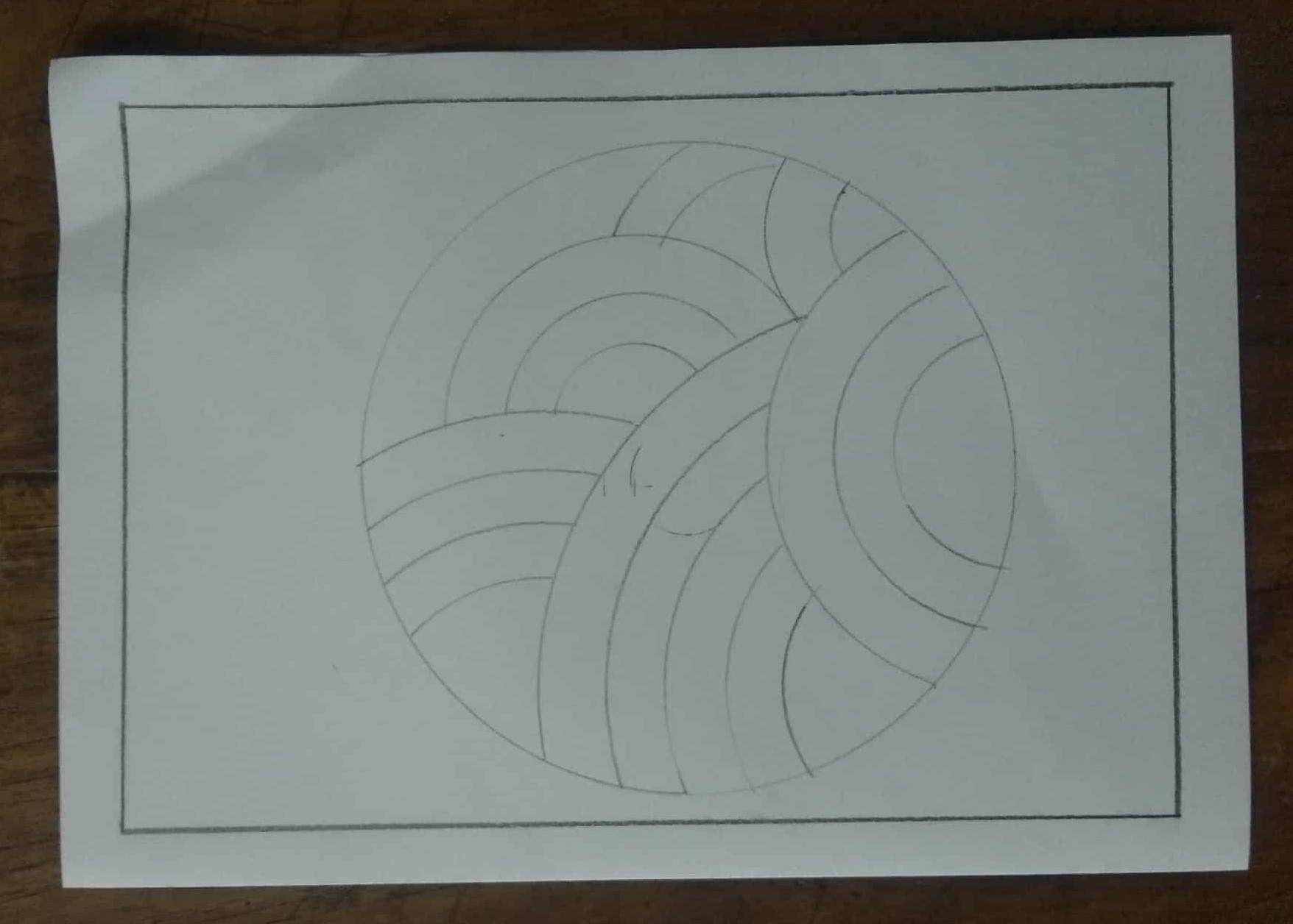 প্রথমে সাদা কাগজের চারপাশে দাগ দিয়ে নিয়েছি। দাগের ভিতরে কয়েকটি অর্ধবৃত্তএঁকে নিয়েছি পেন্সিল কম্পাস দিয়ে।