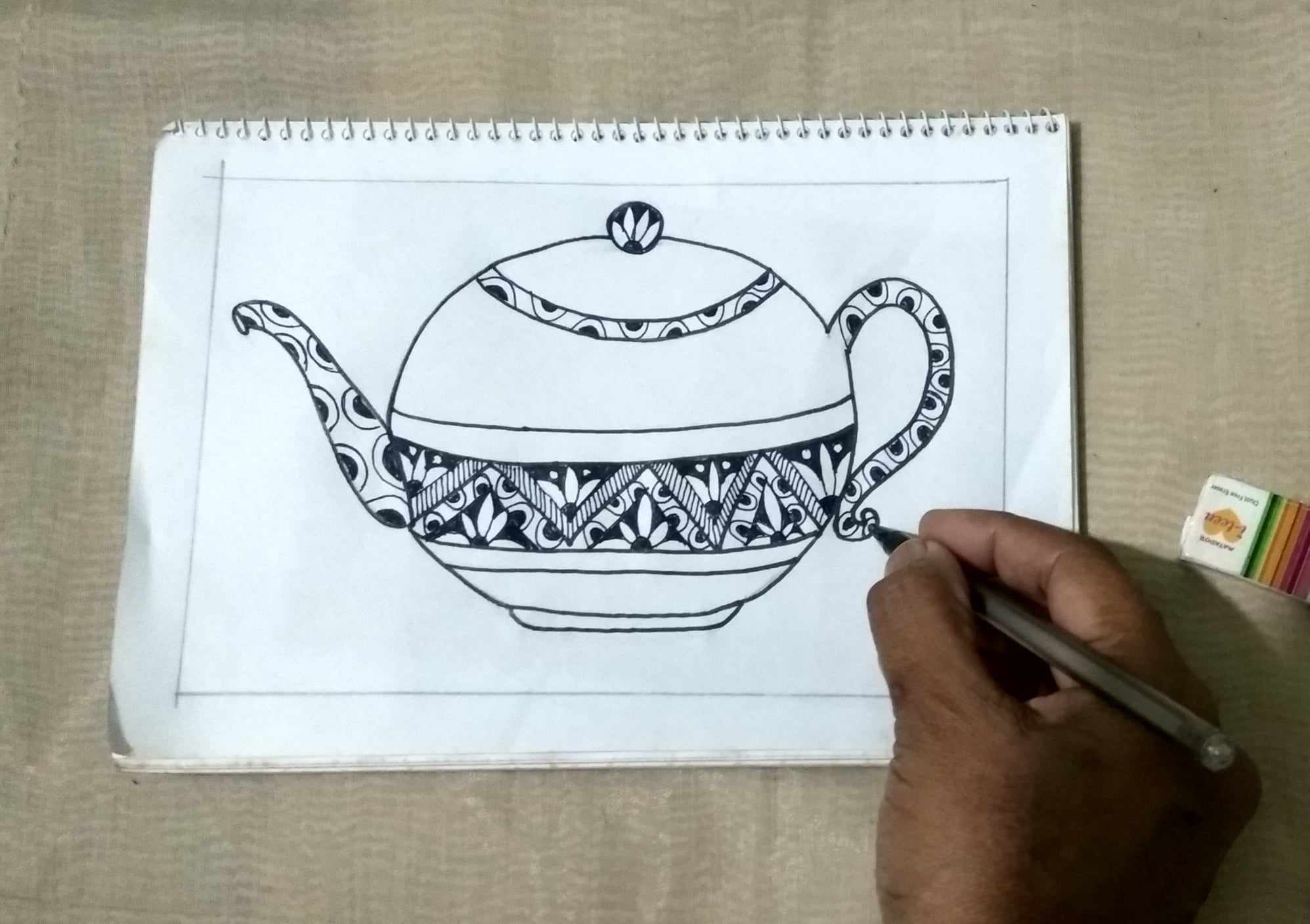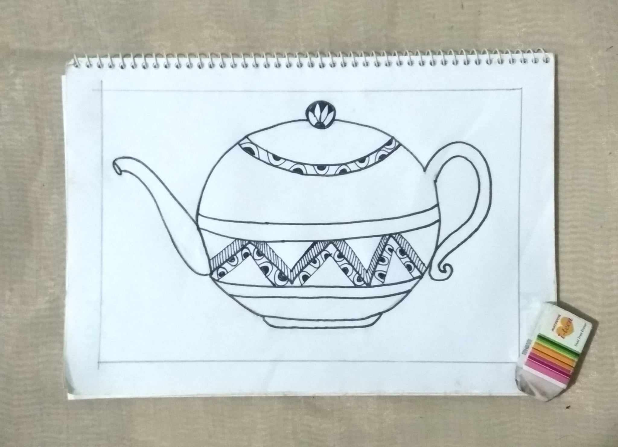 টি পটটির হাতলে ,নলে ও নিচে আরও কিছু বিভিন্ন ধরনে ডিজাইন এঁকে নিয়েছি । এবং সাইন পেন দিয়ে ডিপ কালো করে নিয়েছি।