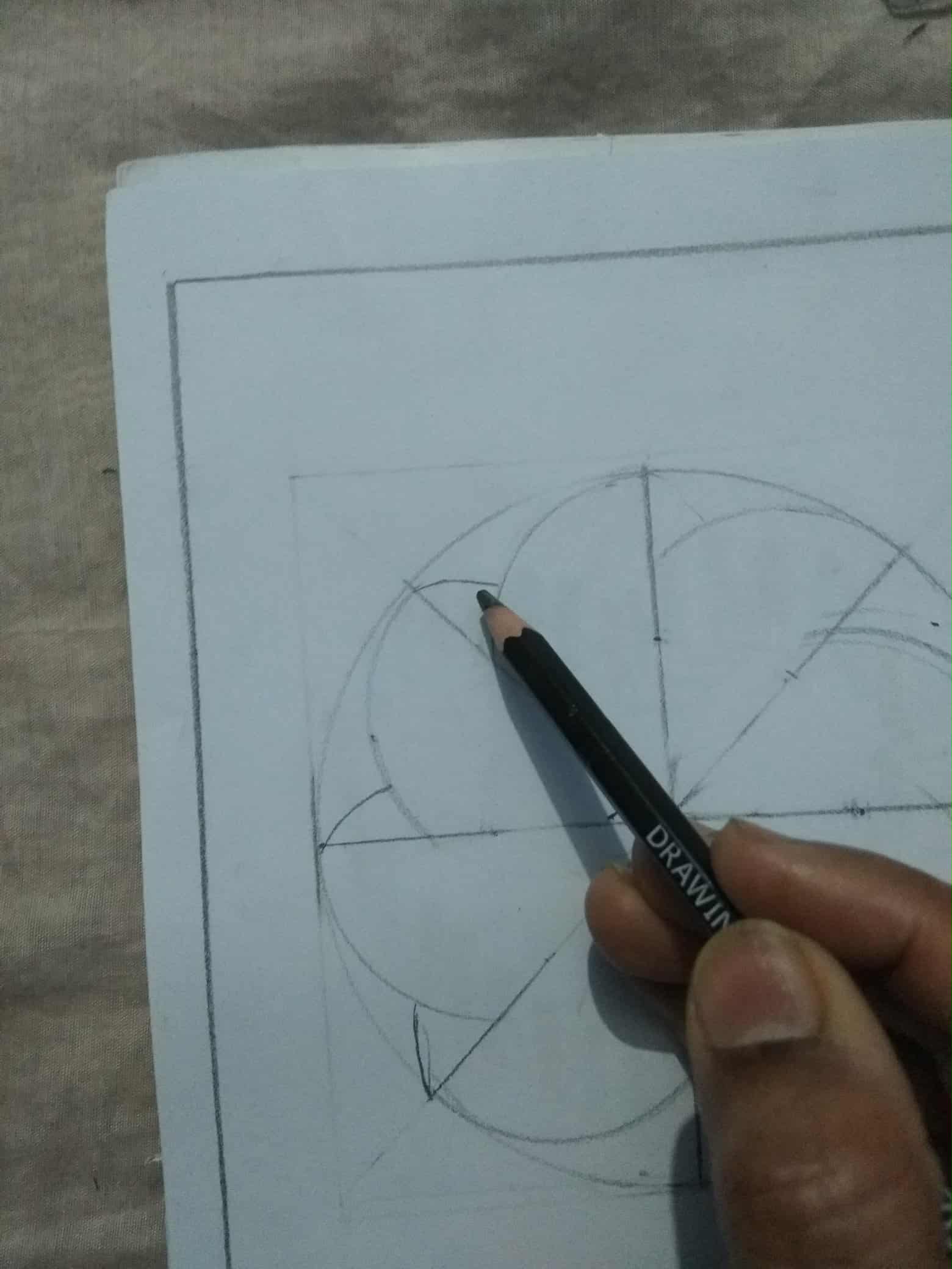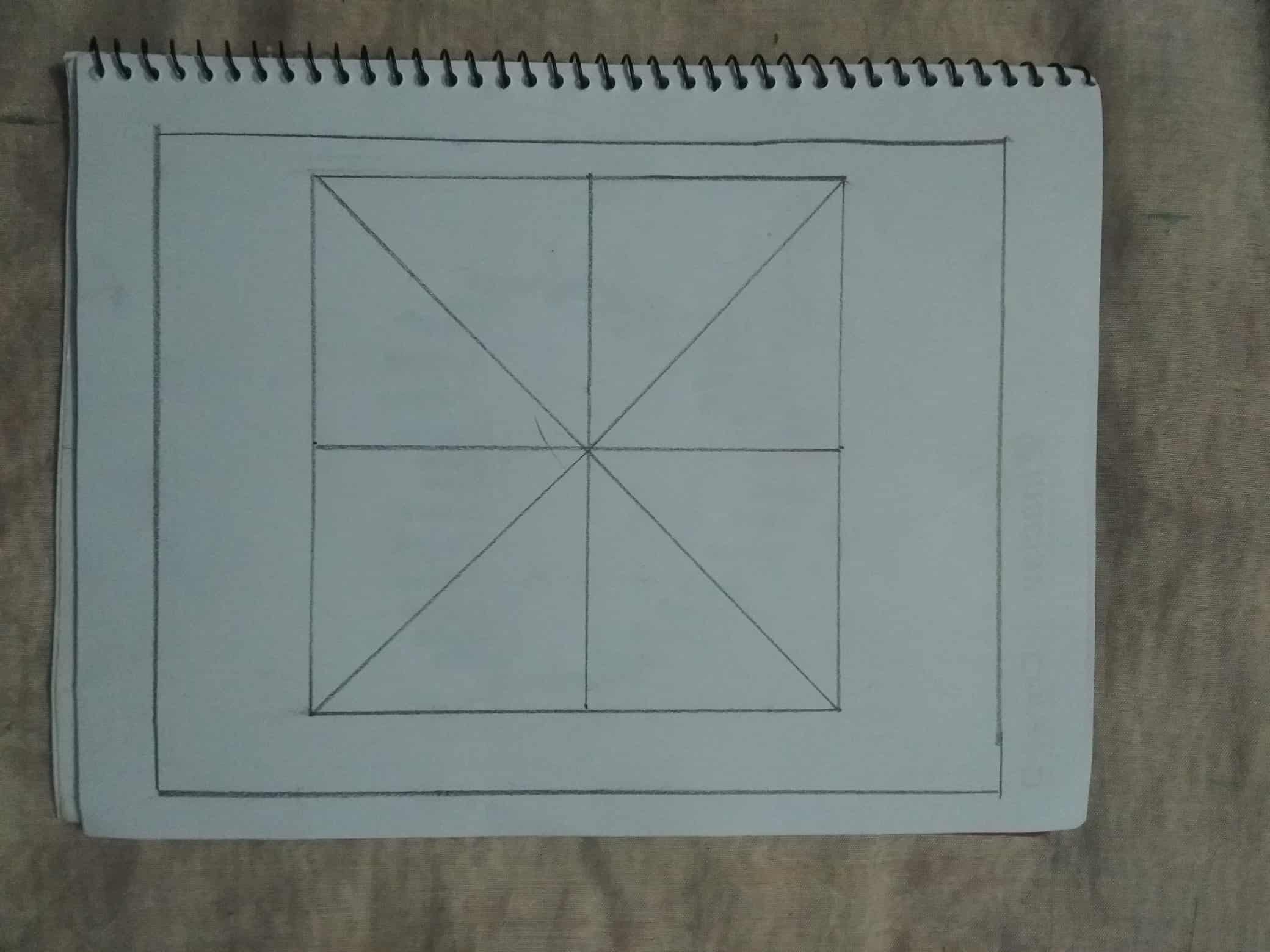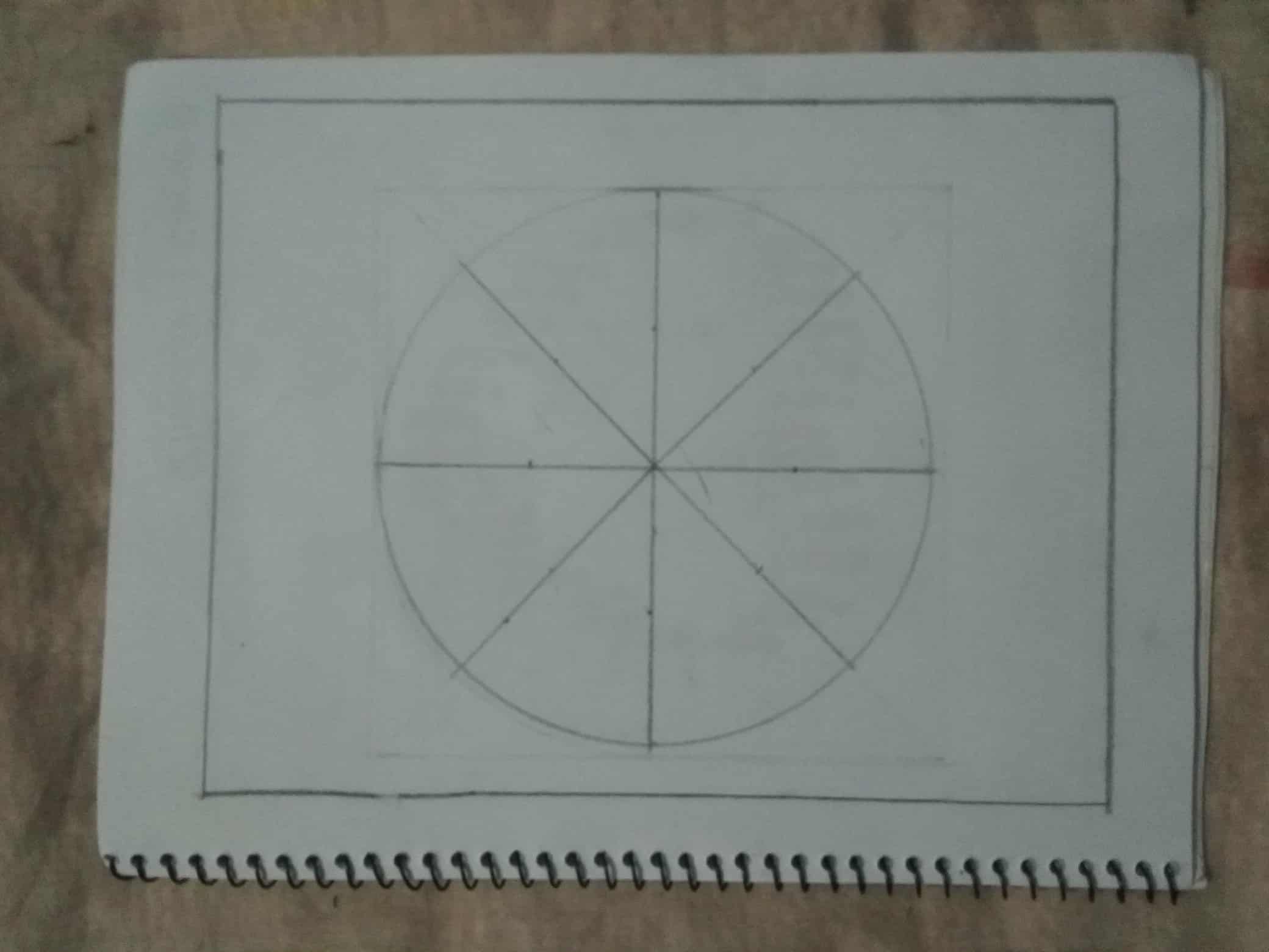 এবার বর্গক্ষেত্রটির কেন্দ্রে পেন্সিল কম্পাস বসিয়ে একটি বৃত্ত এঁকে নিয়েছি।এবং রাবার দিয়ে বার্তি রেখাগুলো মুছে ফেলেছি।