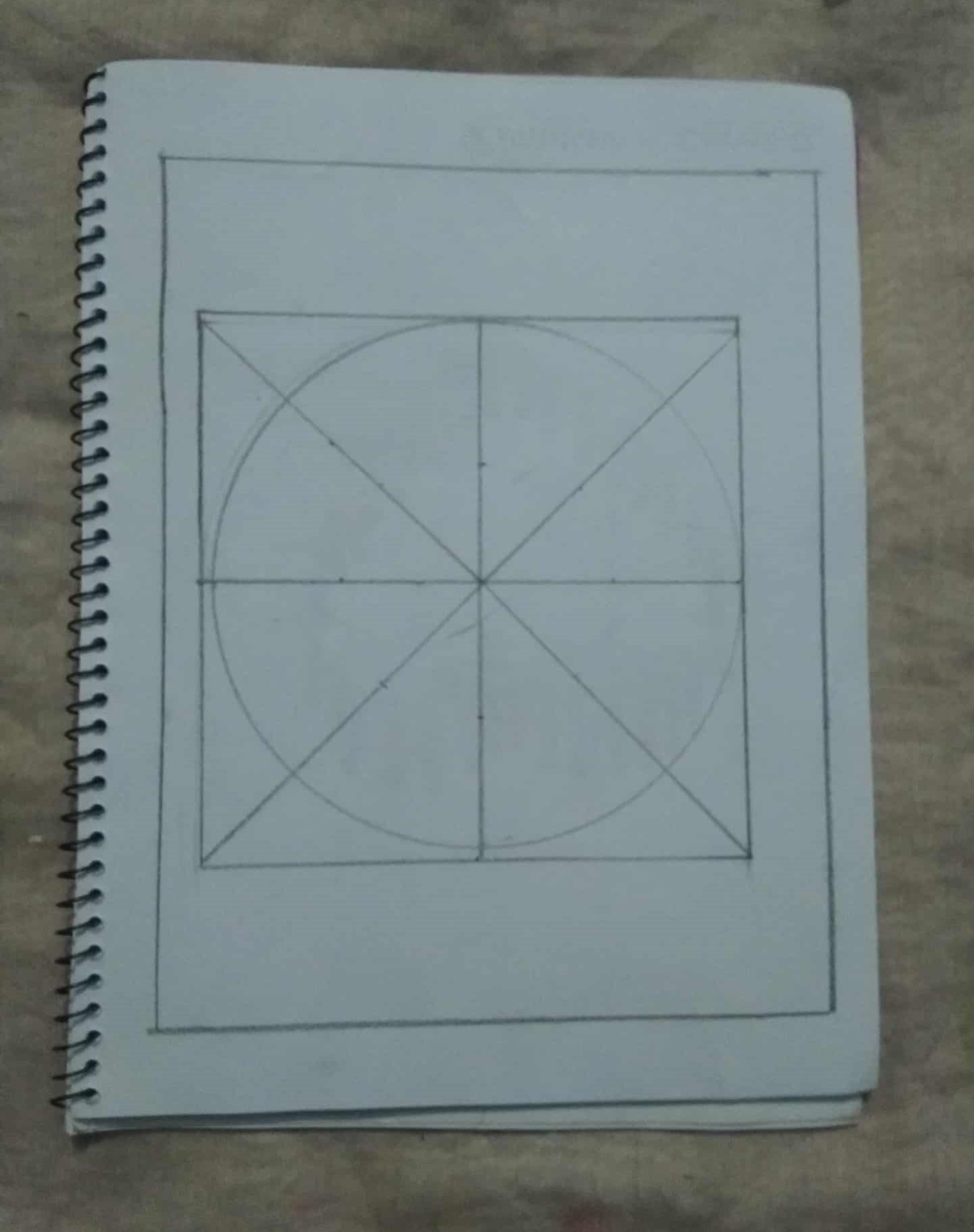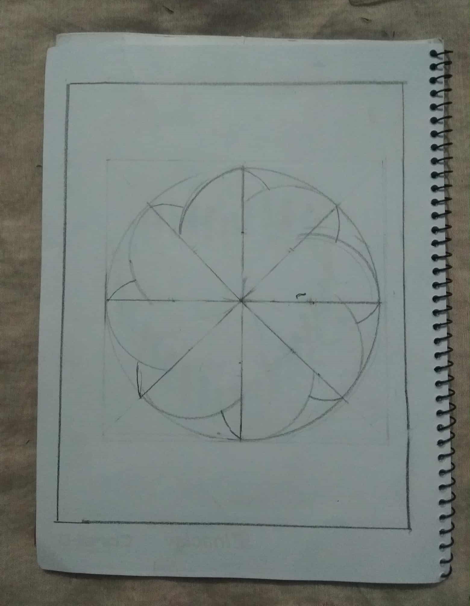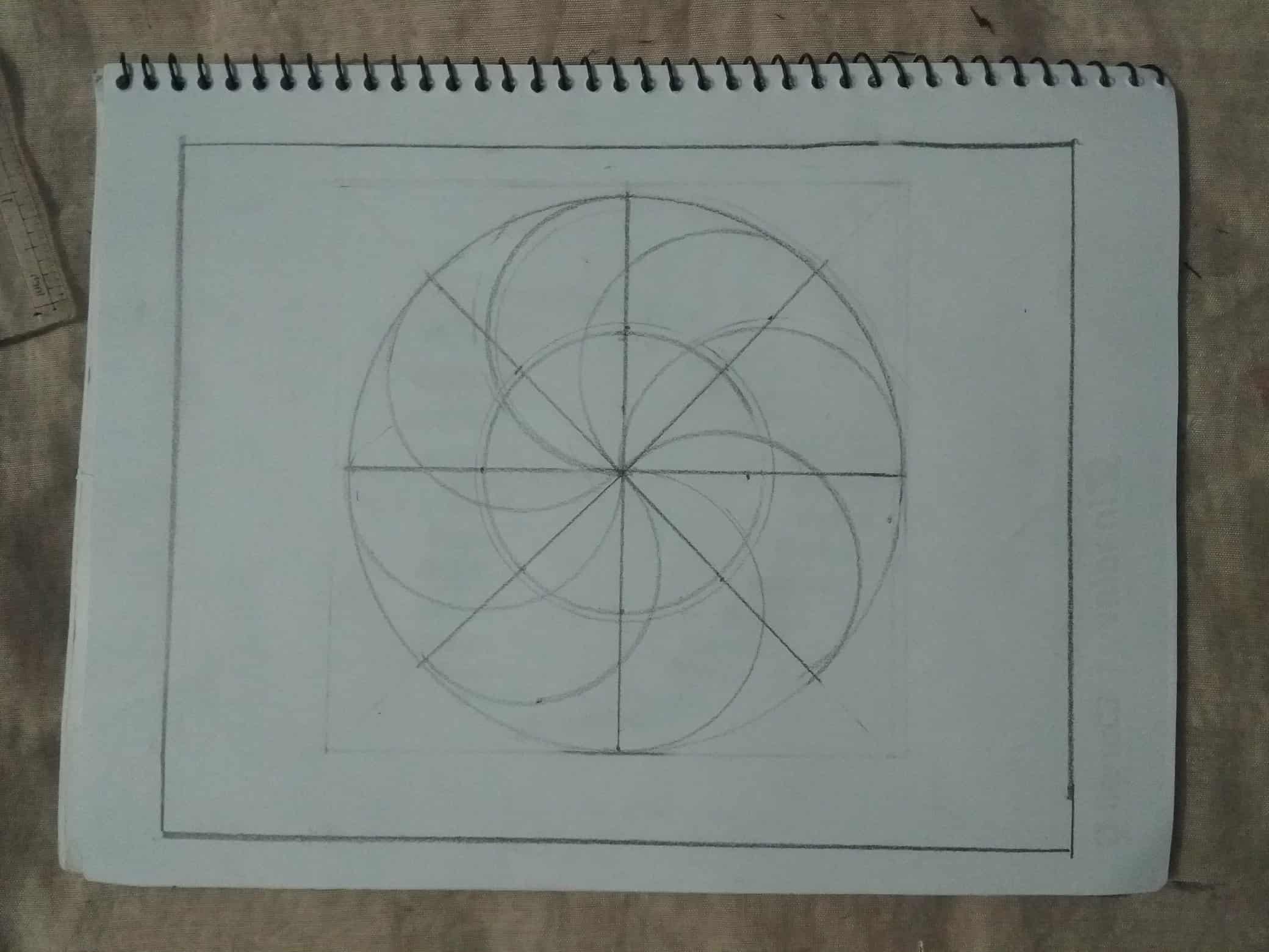এবার বর্গক্ষেত্রটির কেন্দ্রে পেন্সিল কম্পাস বসিয়ে একটি বৃত্ত এঁকে নিয়েছি।এবং রাবার দিয়ে বার্তি রেখাগুলো মুছে ফেলেছি।