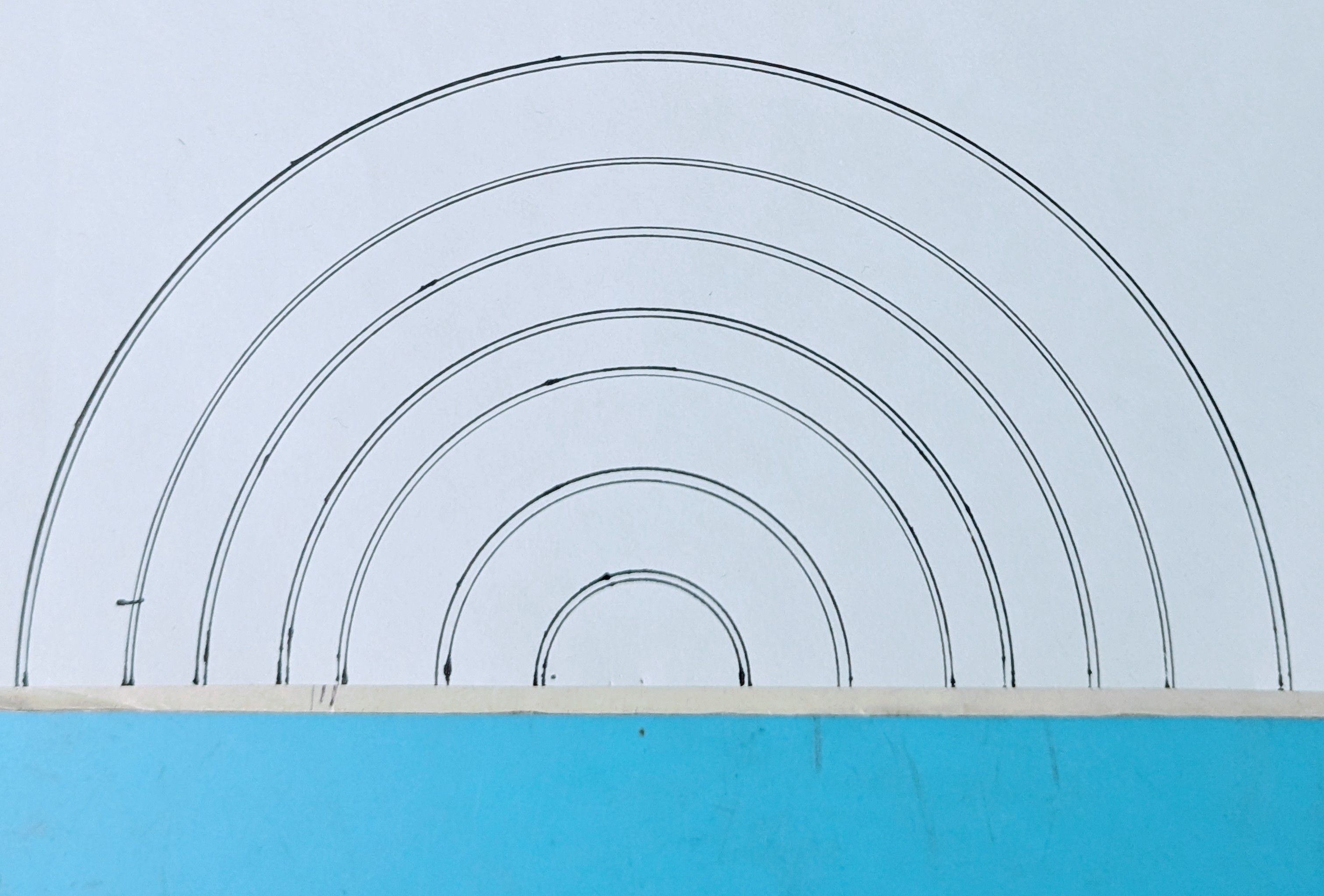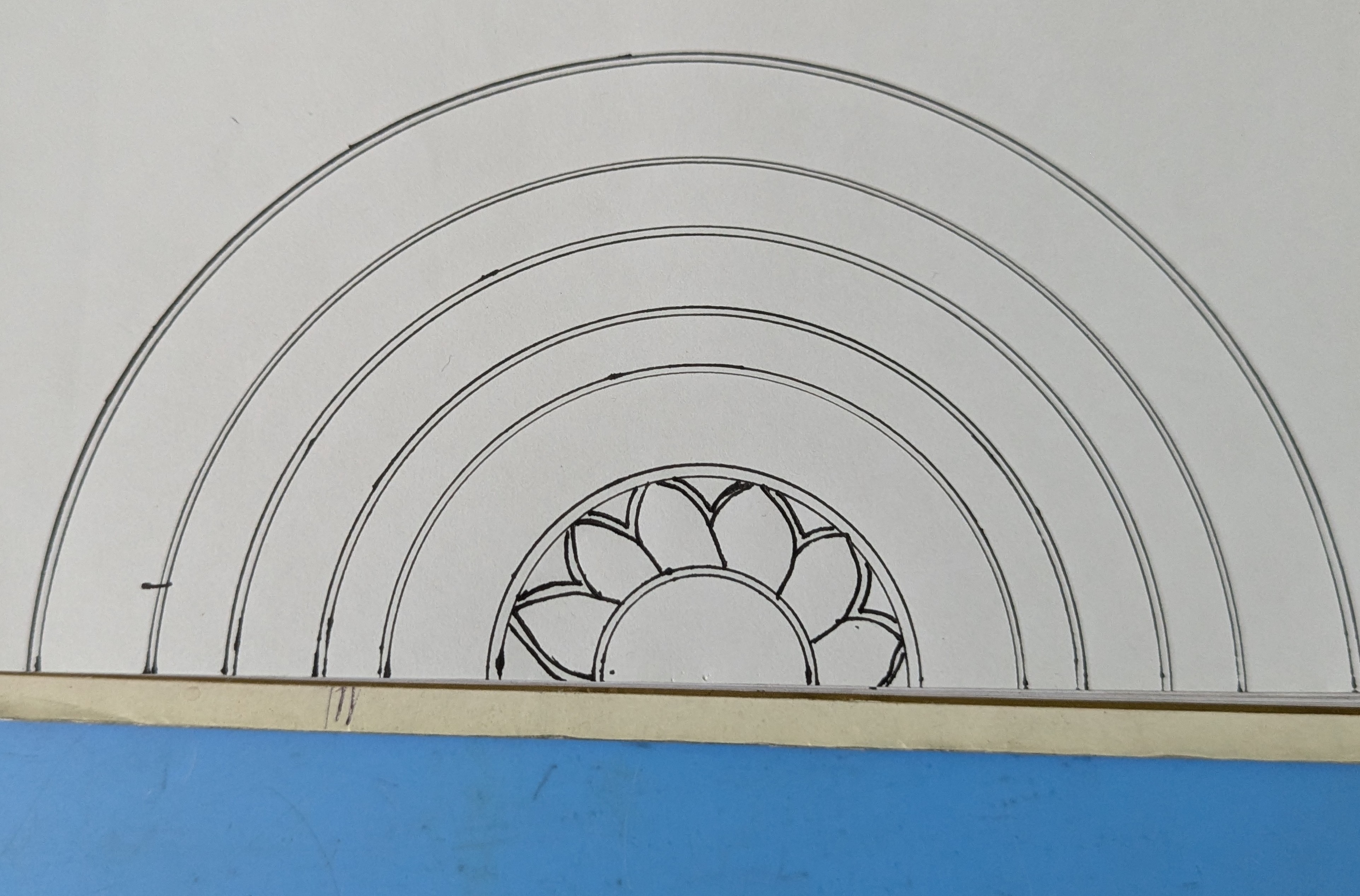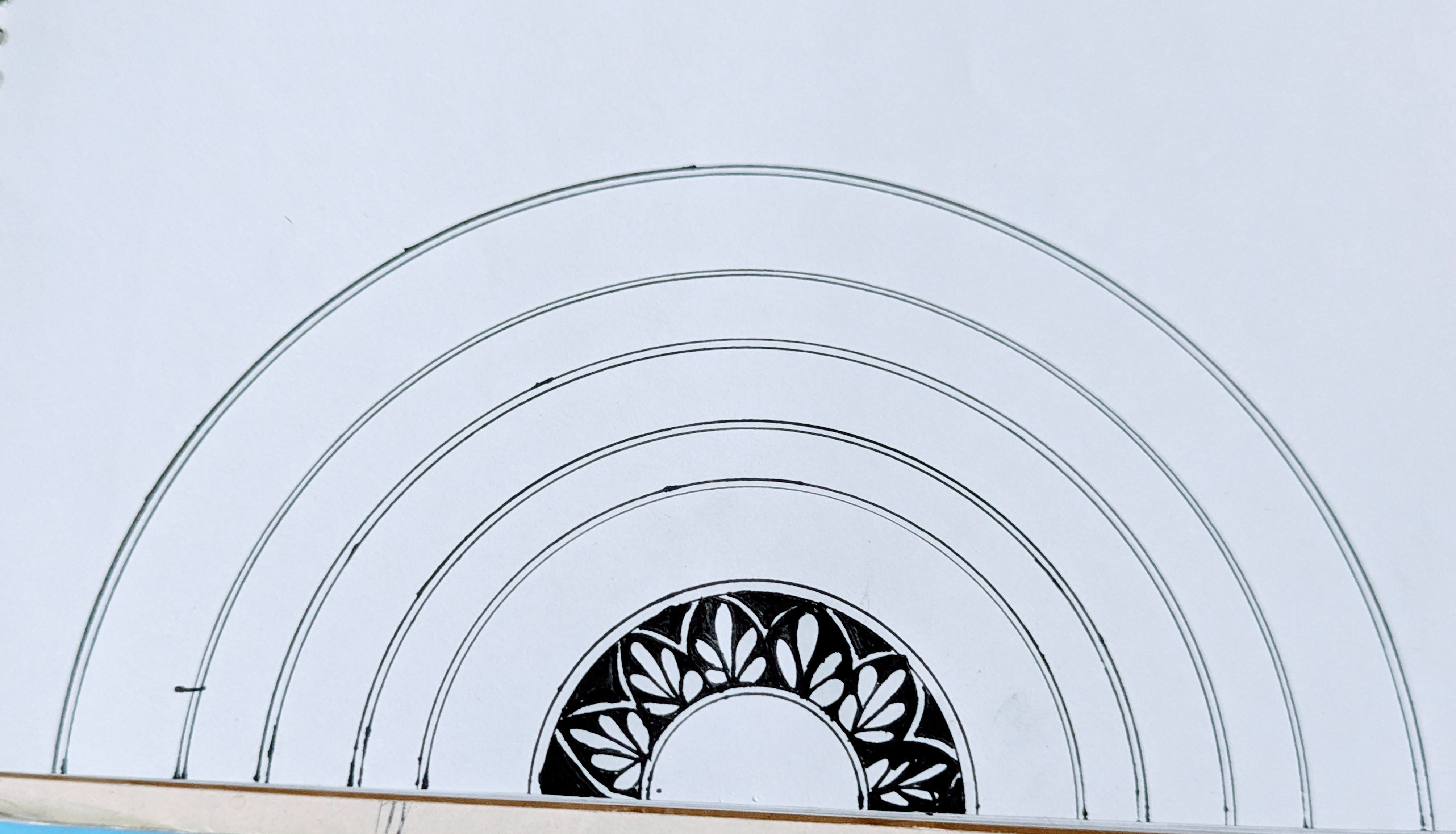 প্রথমে একটি খাতার নিচের অংশের দিকে কম্পাস এবং জেল পেনের সাহায্যে কয়েকটি অর্ধবৃত্ত এঁকে নিয়েছি।