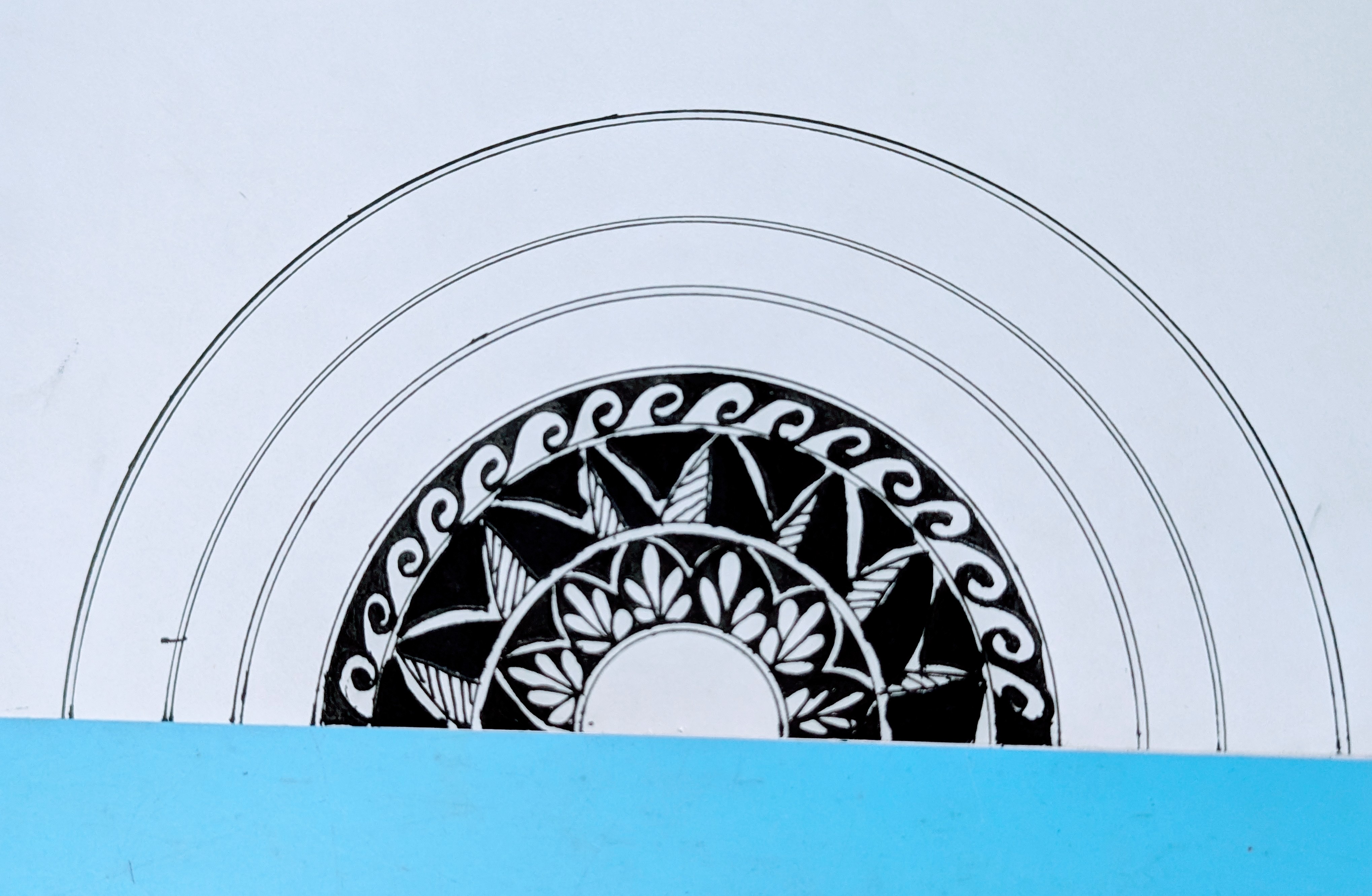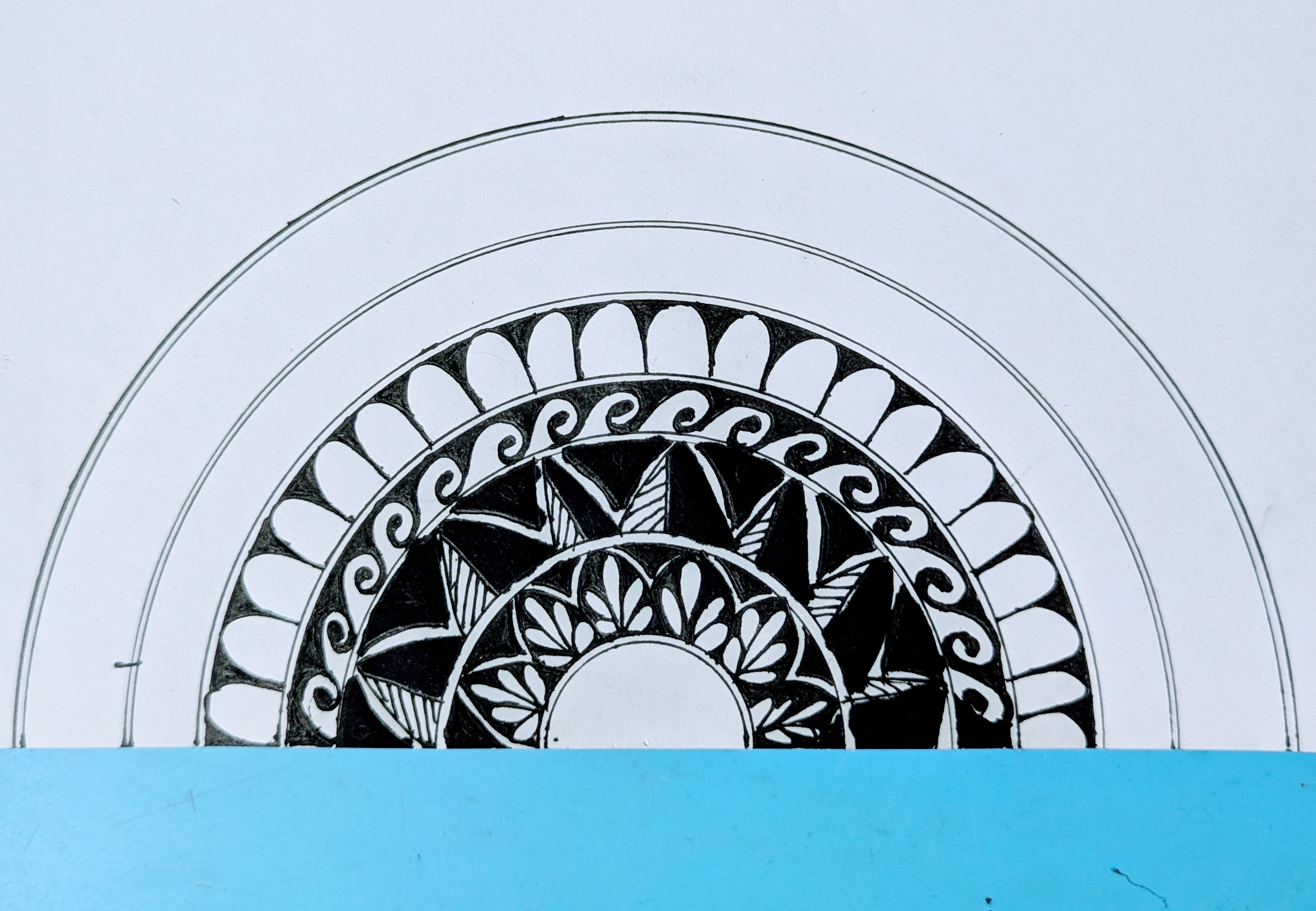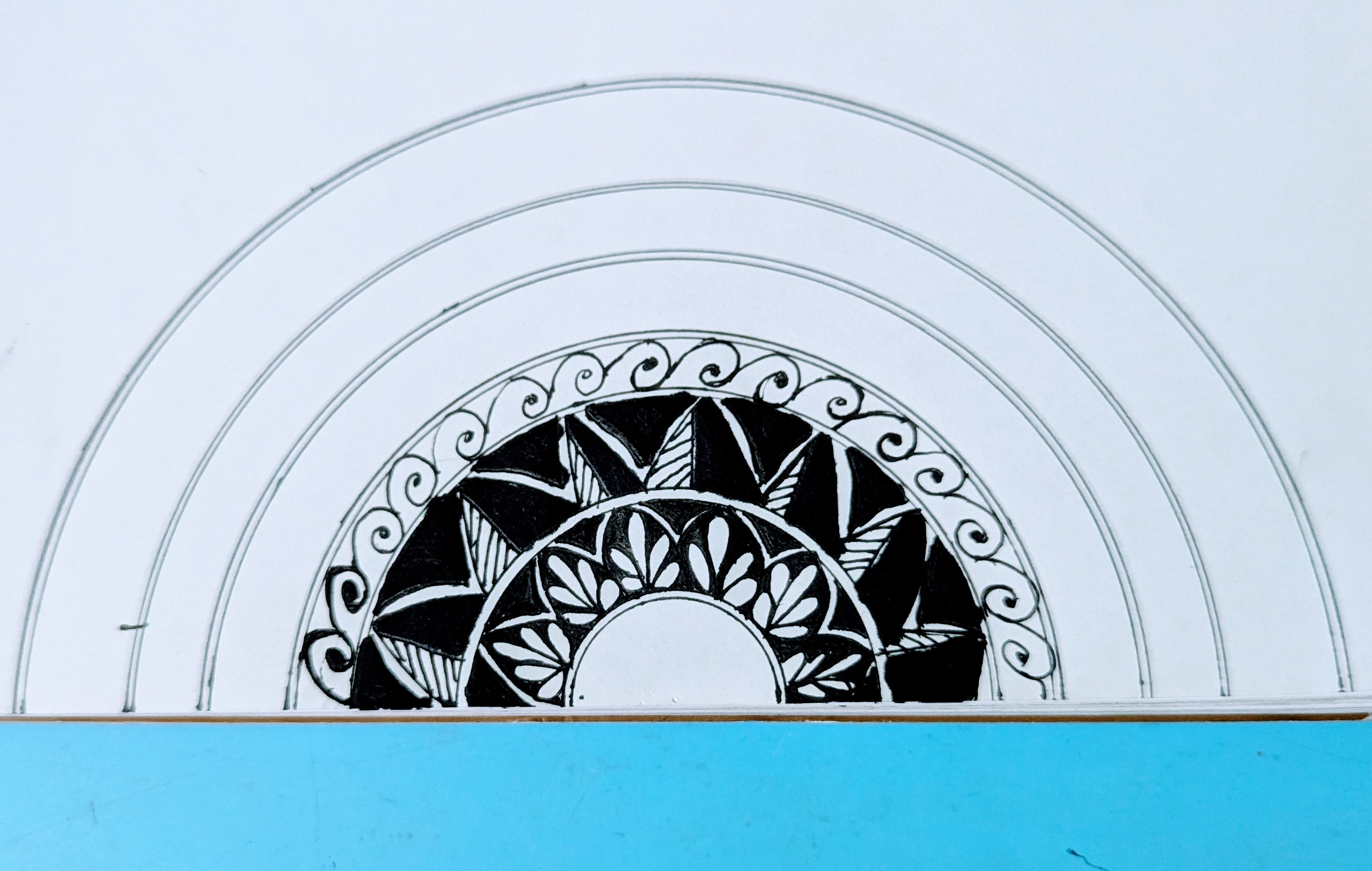 প্রথমে একটি খাতার নিচের অংশের দিকে কম্পাস এবং জেল পেনের সাহায্যে কয়েকটি অর্ধবৃত্ত এঁকে নিয়েছি।