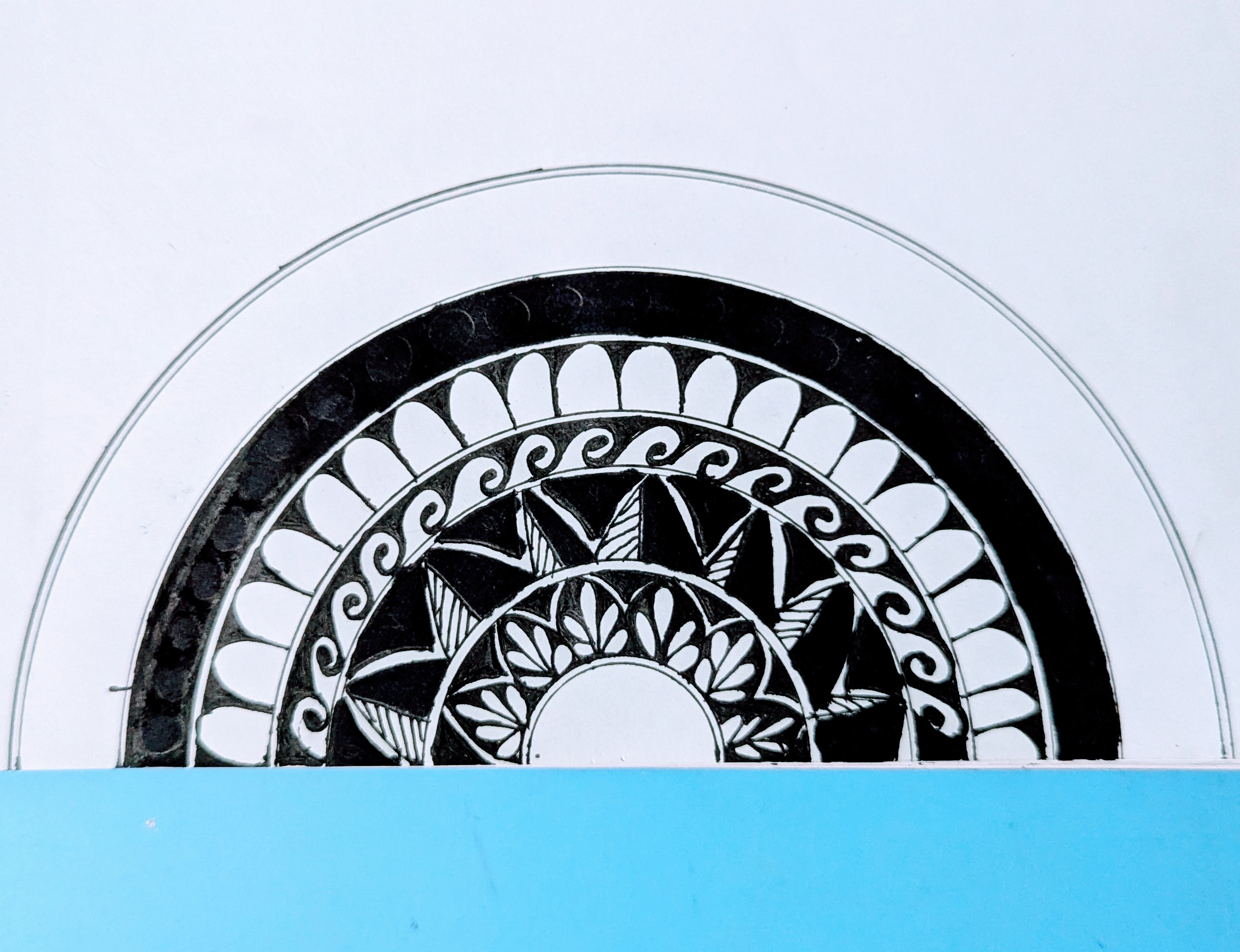 তারপর অর্ধবৃত্তের সর্বশেষ অংশে জেল কলম এর সাহায্যে চিকন চিকন দাগ দিয়ে নিয়েছি।তারপর ছোট ছোট ডিজাইন করে নিয়েছি।