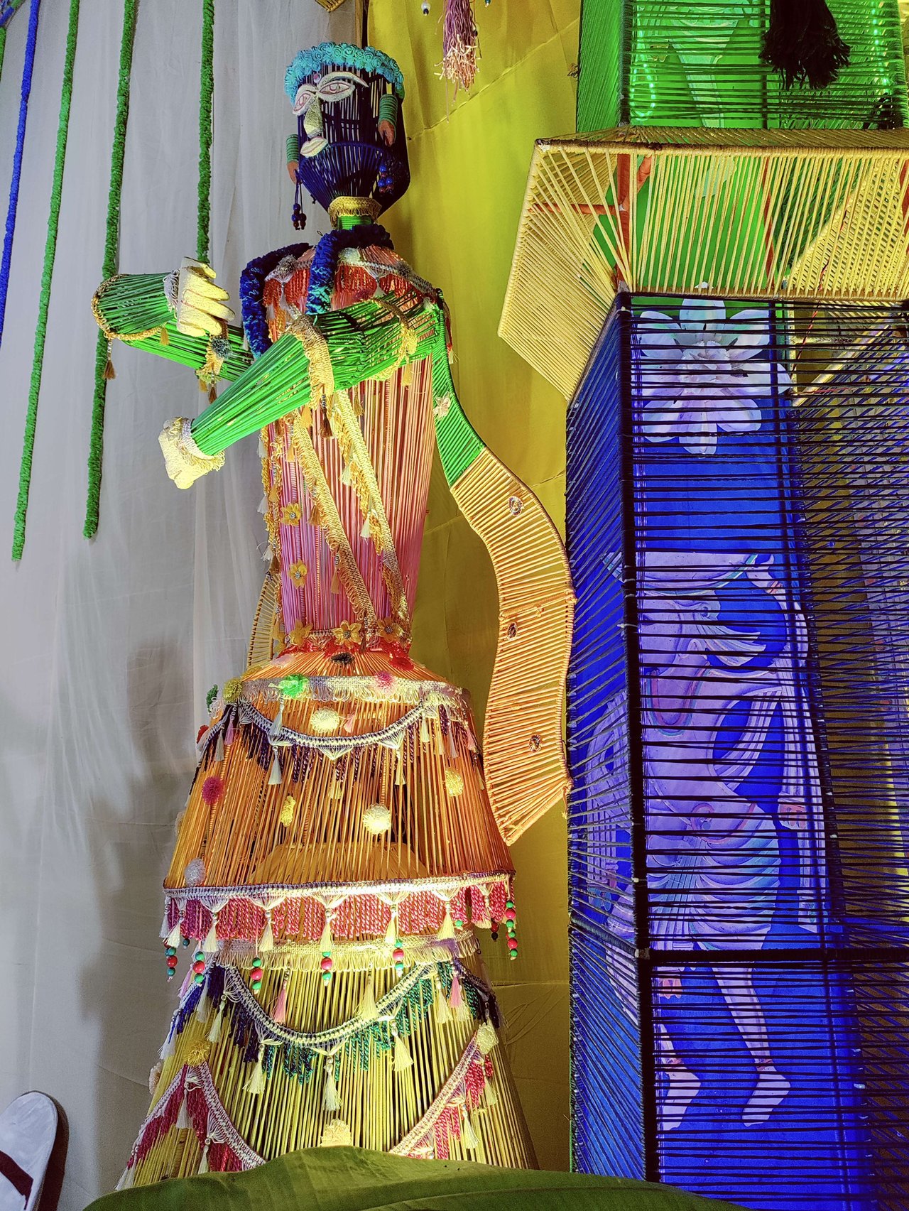 আজকের পর্ব হলো এই সিরিজের একদম শেষ পর্ব । এই পুজো প্যান্ডেলটা দেখা শেষ করতে করতে রাত প্রায় ন'টা বেজে গিয়েছিলো । তাই এরপরে আর কোনো পুজো না দেখেই আমরা বাড়ি ফিরে এসেছিলুম । লাস্ট পুজো প্যান্ডেলটাও দারুন সুন্দর ছিল । এই পুজো প্যান্ডেলের বৈশিষ্ট্য ছিল এটি সম্পূর্ণ বেত, বাঁশ, কাপড়, পাটের দড়ি আর কাগজ দিয়ে তৈরী । তবে প্রধান উপকরণ অবশ্যি বেত ।