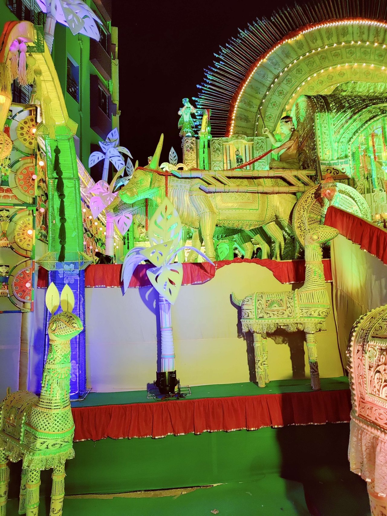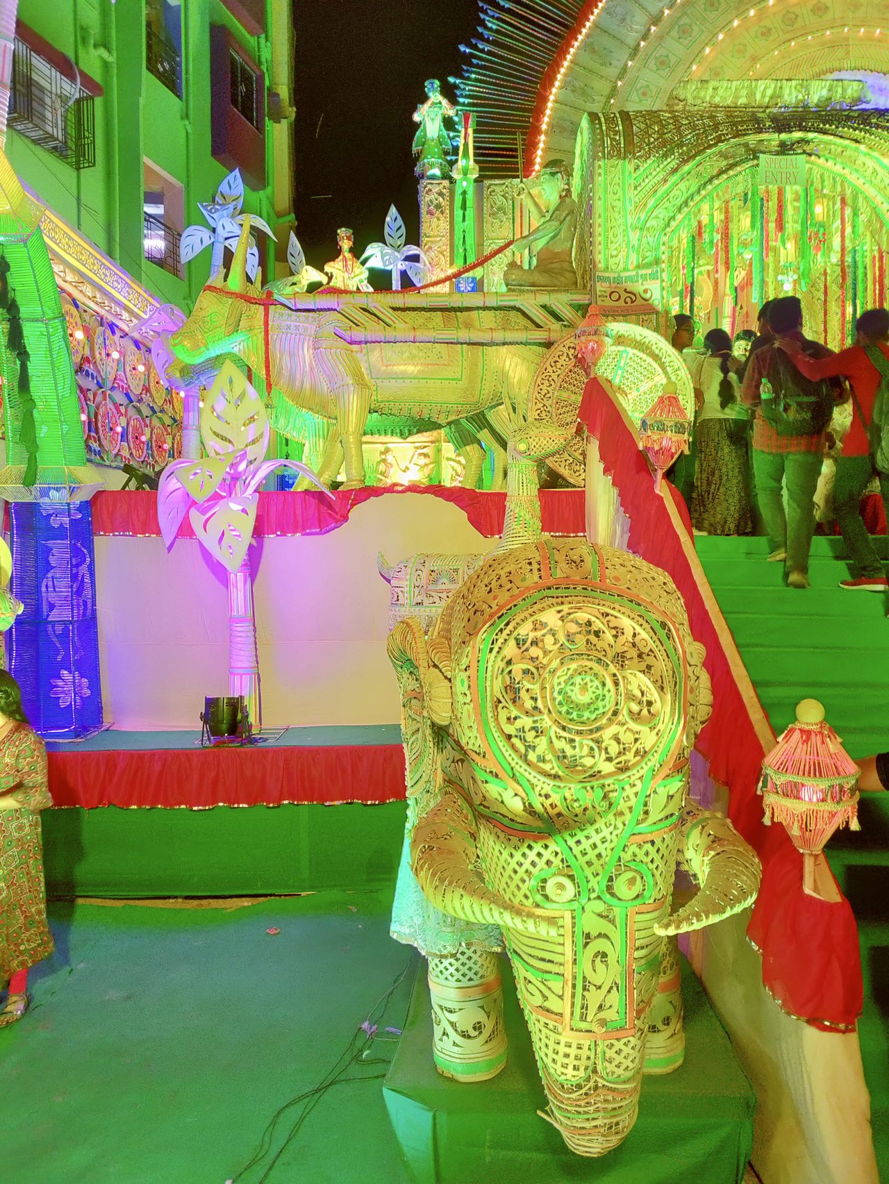 এটাই ছিল এই পুজো প্যান্ডেলের মুখ্য প্রচারণা । তবে বেত দিয়ে হাতি, ঘোড়া, গরু, গরুর গাড়ি, পাখি, মানুষ, গাছগাছালি এত নিখুঁত সুন্দর ভাবে তৈরী করেছিল যে দেখলে চোখ ফেরানো কঠিন । আর একটা বিষয় ছিল ভিআইপি পাস্ ছিল যাঁদের তাঁদের জন্য নির্দিষ্ট কোনো নির্ধারিত সময় ফিক্সড ছিল না প্যান্ডেল ঘুরে দেখার । অন্যদের যেখানে বরাদ্দ মোটে ৩-৫ মিনিট । অন্যখানে ভিআইপি পাস্ধারীদের তেমন কোনো টাইম লিমিটেশন নেই । তাই আমরা অনেকটা সময় ধরে খুঁটিয়ে খুঁটিয়ে বেতের তৈরী এই সব দারুন সুন্দর মানুষ, হাতি, ঘোড়া, গরুর গাড়ি, নৌকা, মাছ, ফুল, পাখির মডেল দেখেছিলাম ।