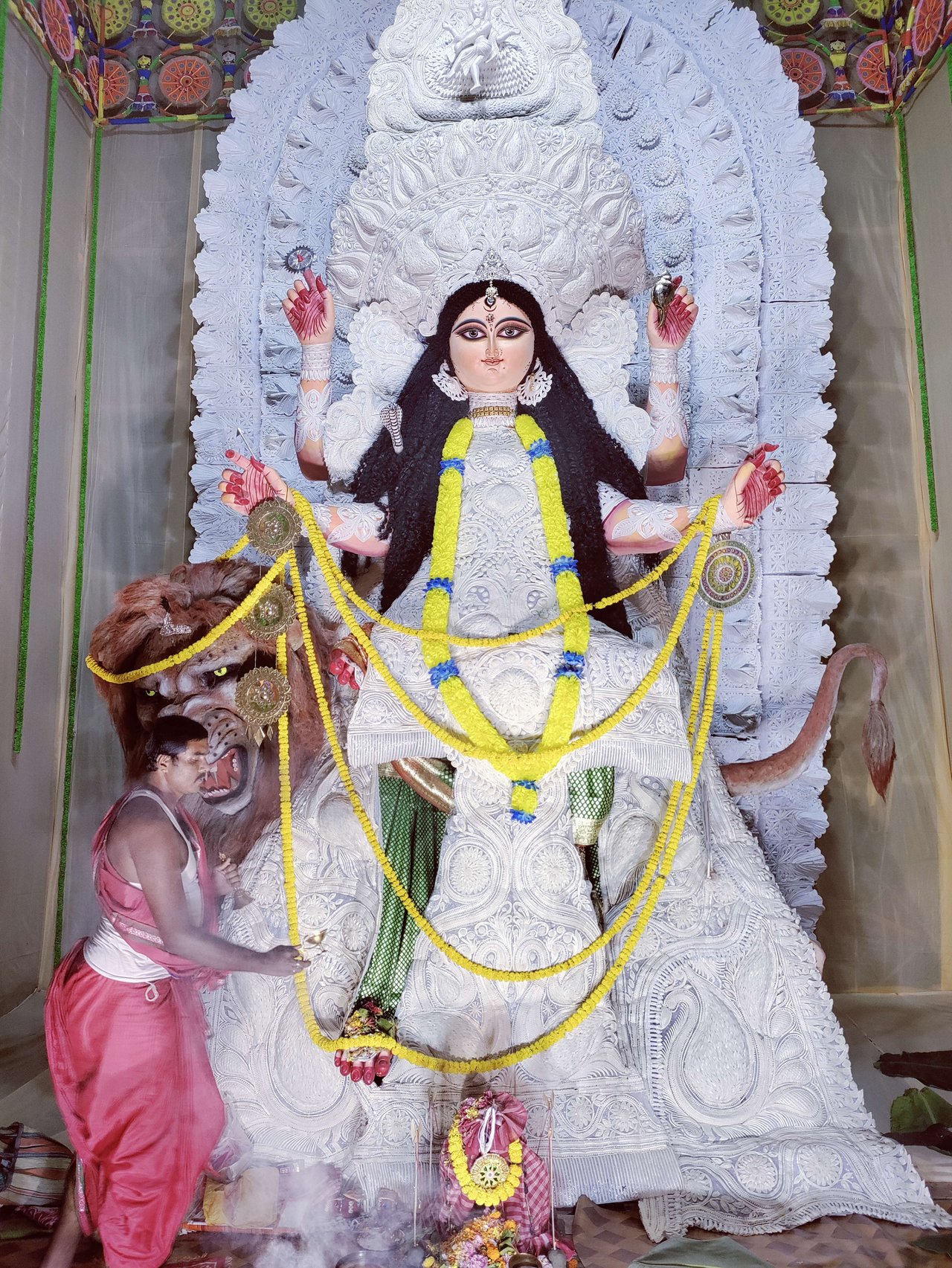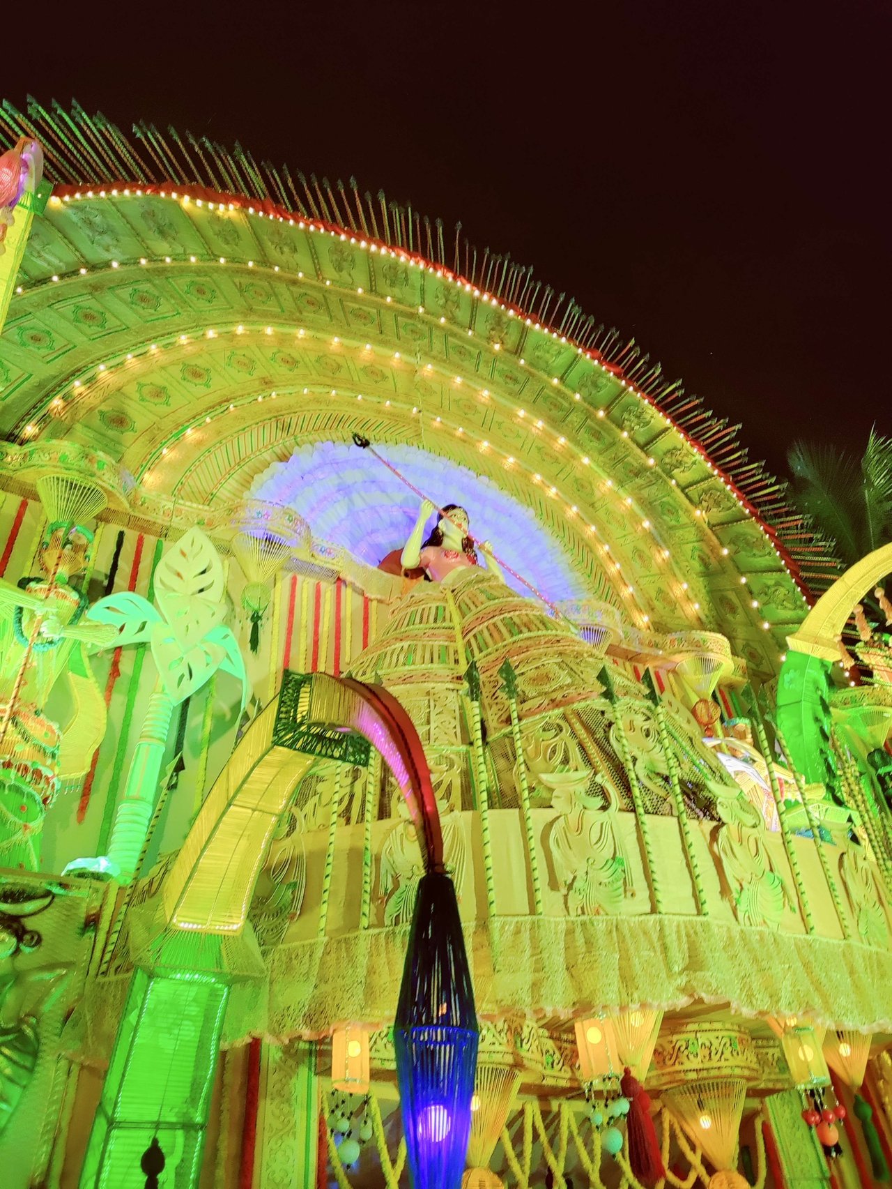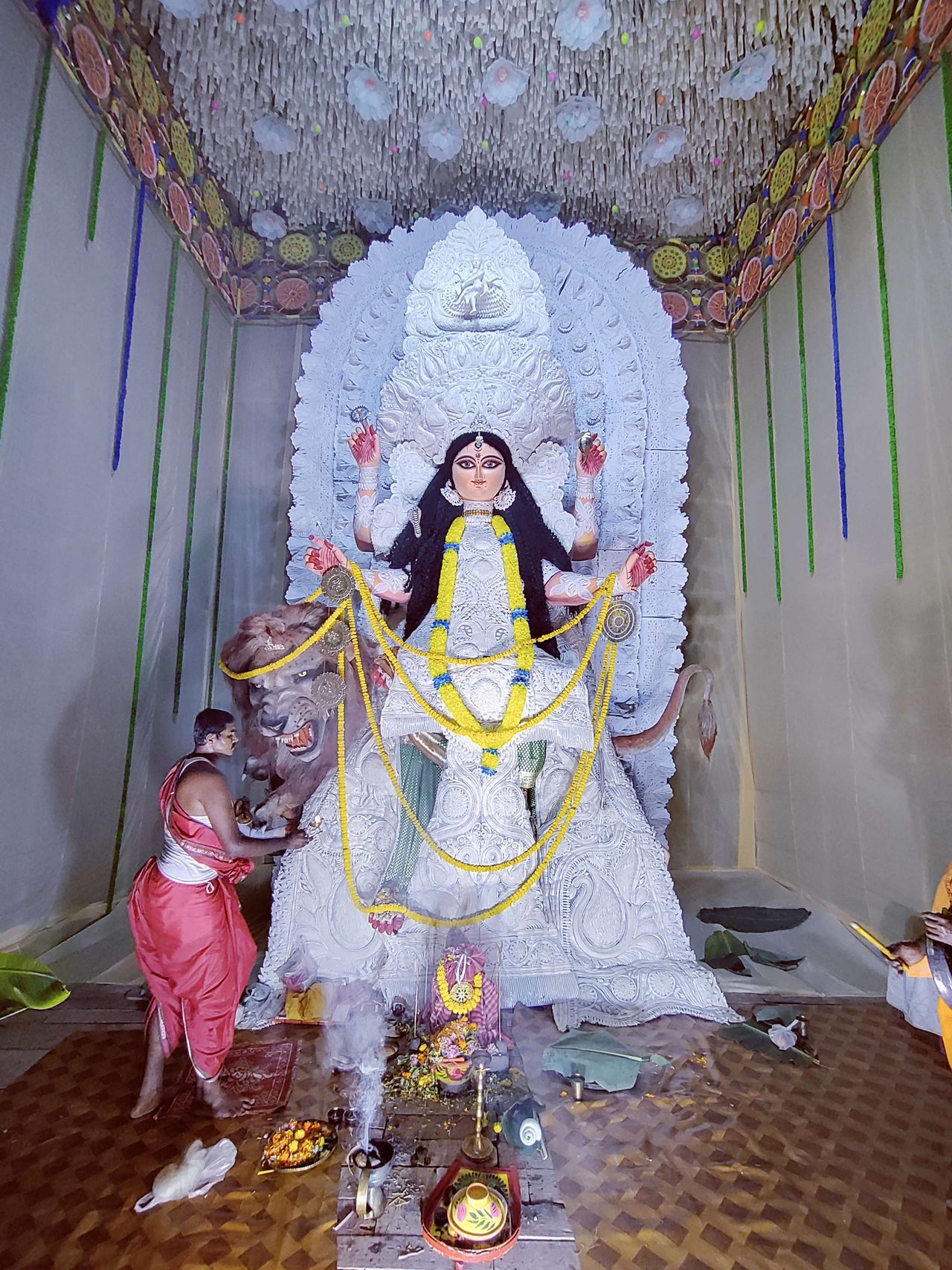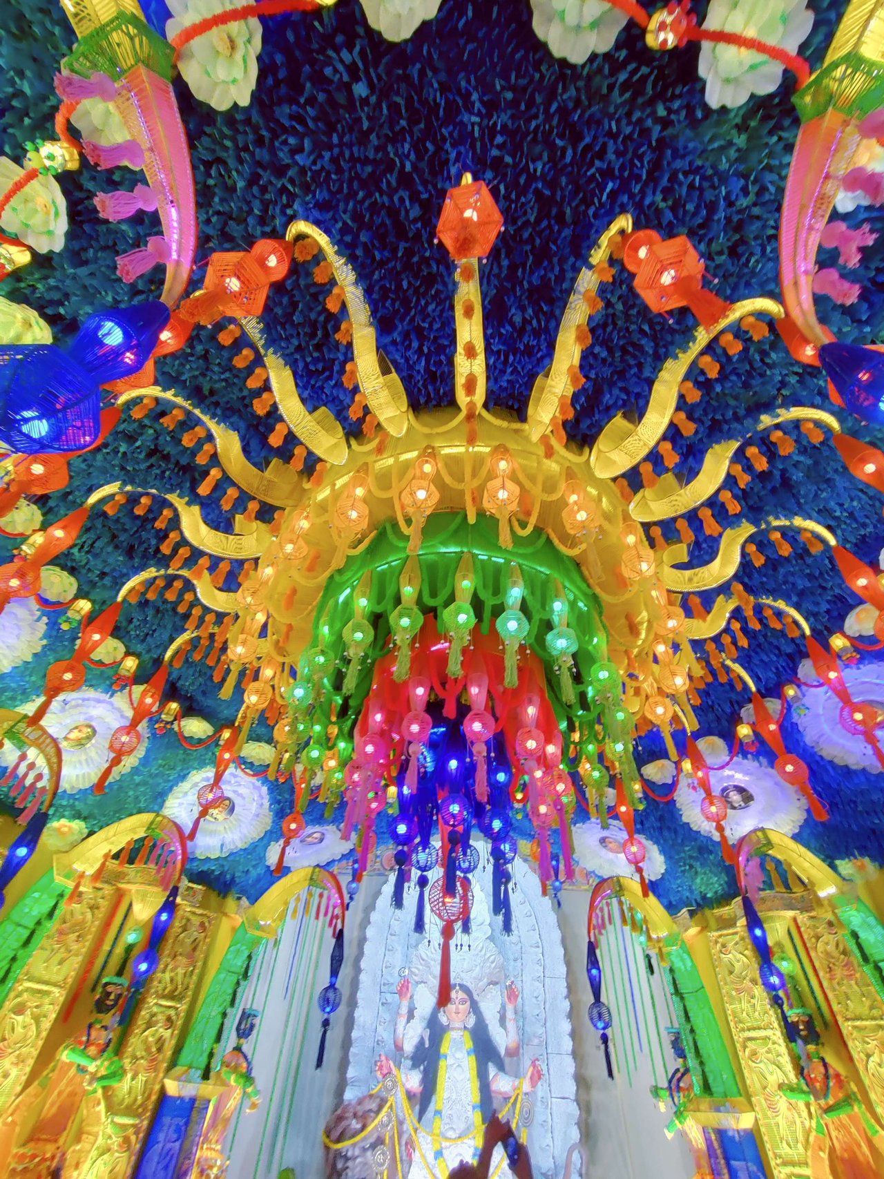 প্যান্ডেলের অভ্যন্তরভাগও দারুনরূপে সুসজ্জিত । আর দেবী প্রতিমাটির উচ্চতা ছিল প্রায় তিন মানুষ । অপরূপা দেবী মূর্তি, দারুন সাজে সজ্জিতা ।