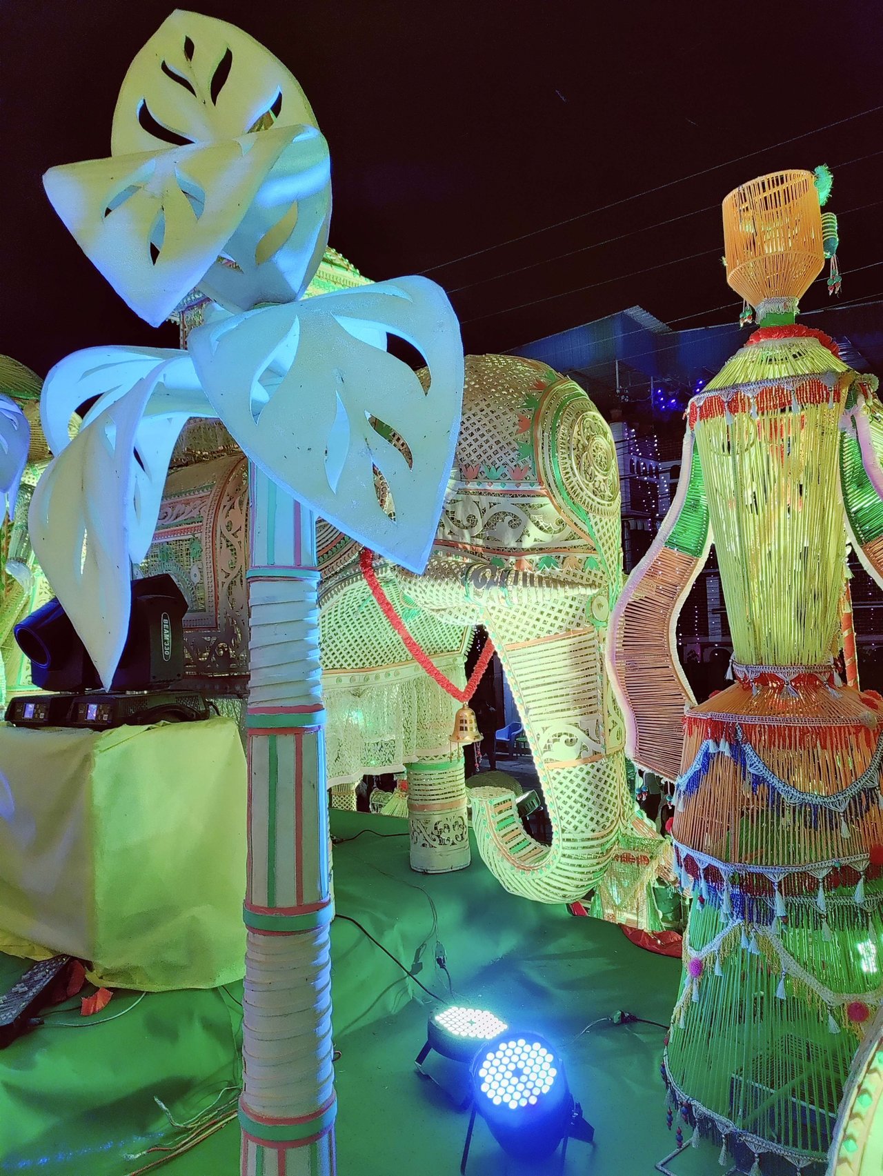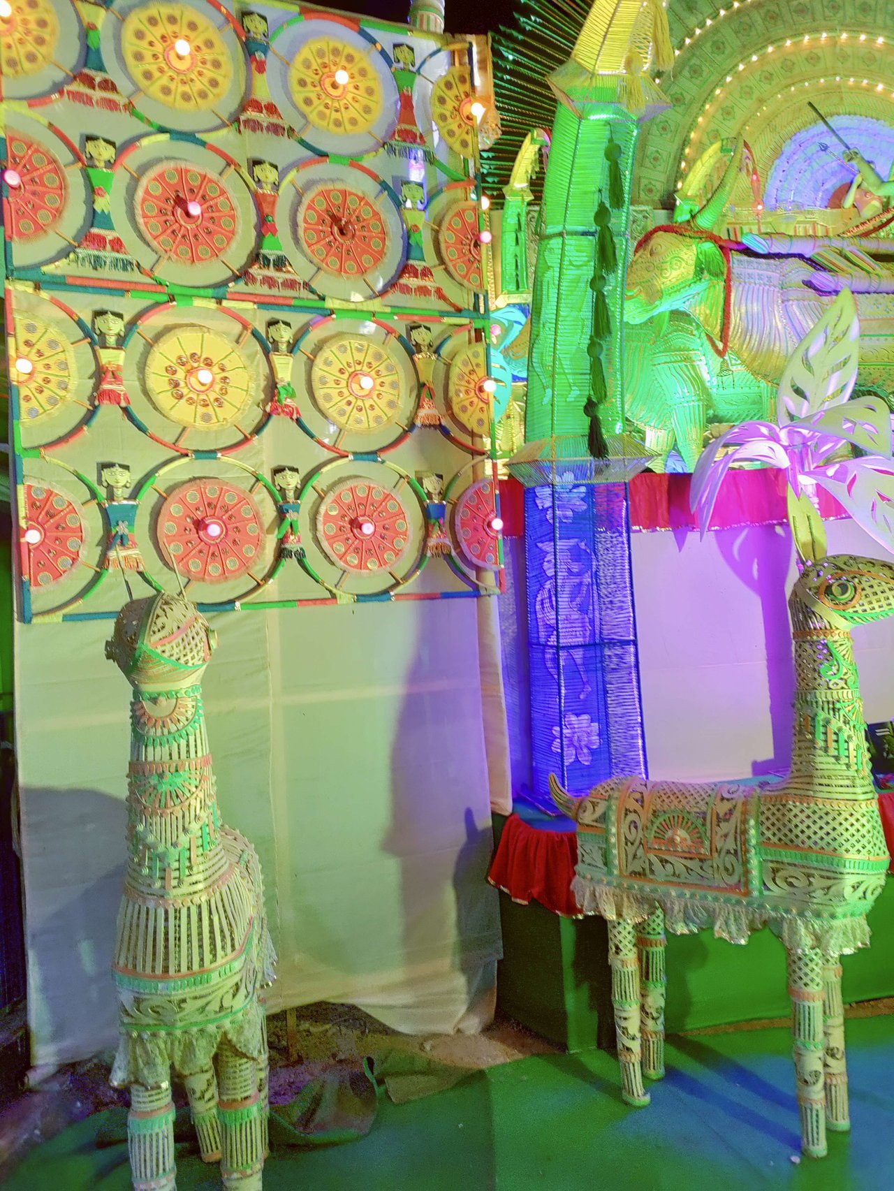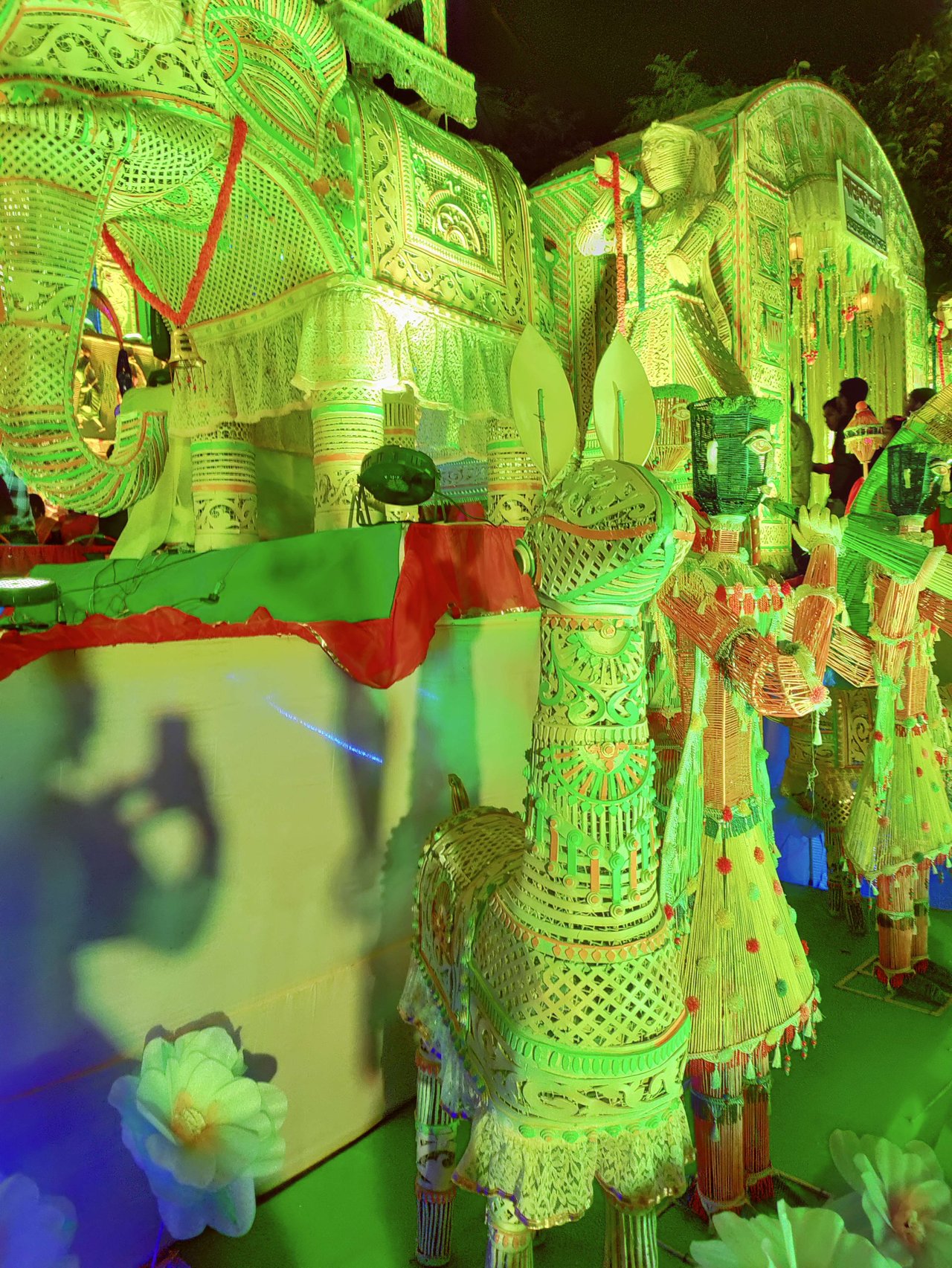 সম্পূর্ণ পুজো প্যান্ডেলটাই বেত দিয়ে তৈরী । এছাড়াও মানুষ, হাতি, ঘোড়া, গরুর গাড়ি, নৌকা, মাছ, ফুল, পাখির মডেলগুলোও সব বেতেরই তৈরী ।