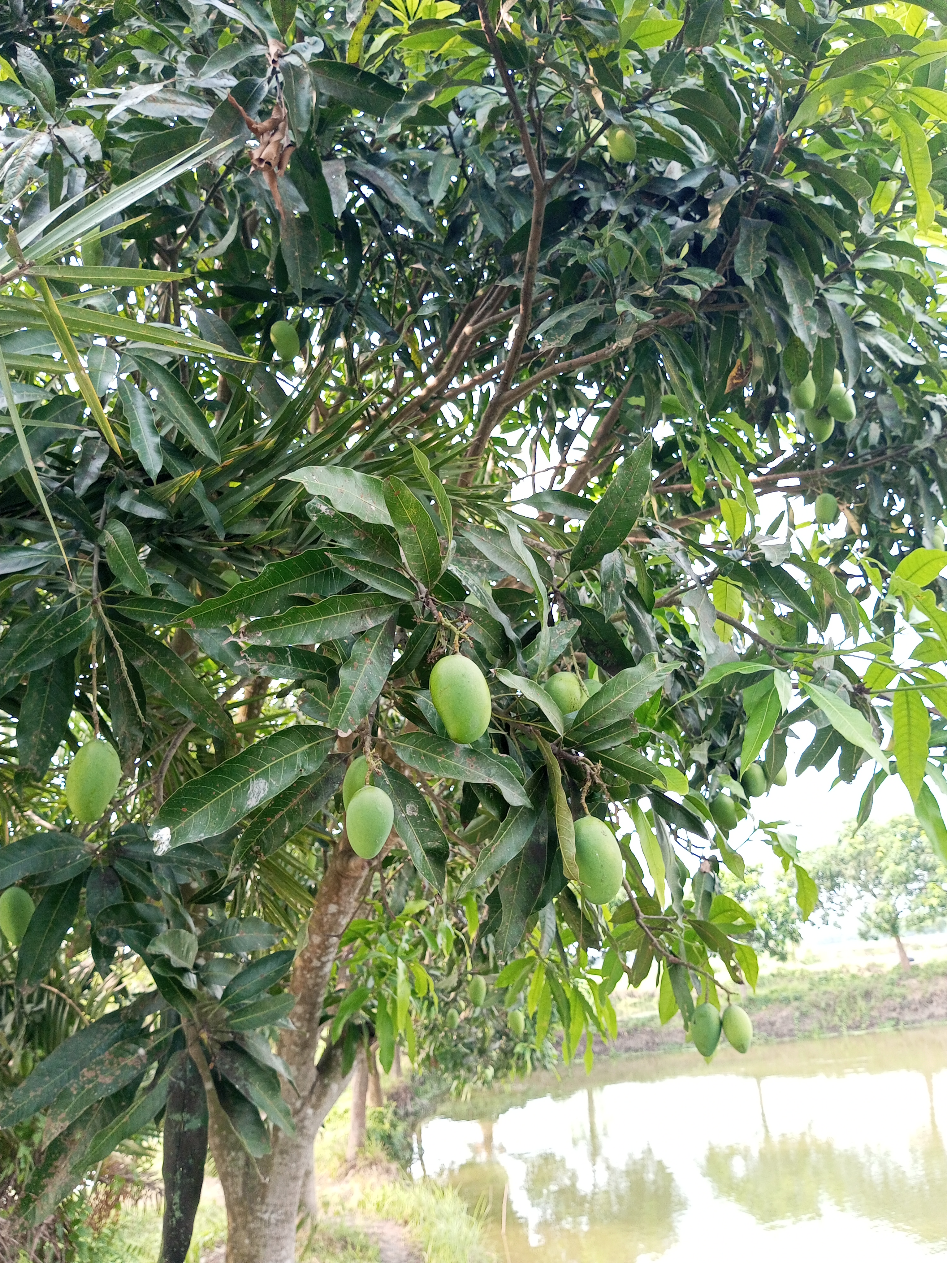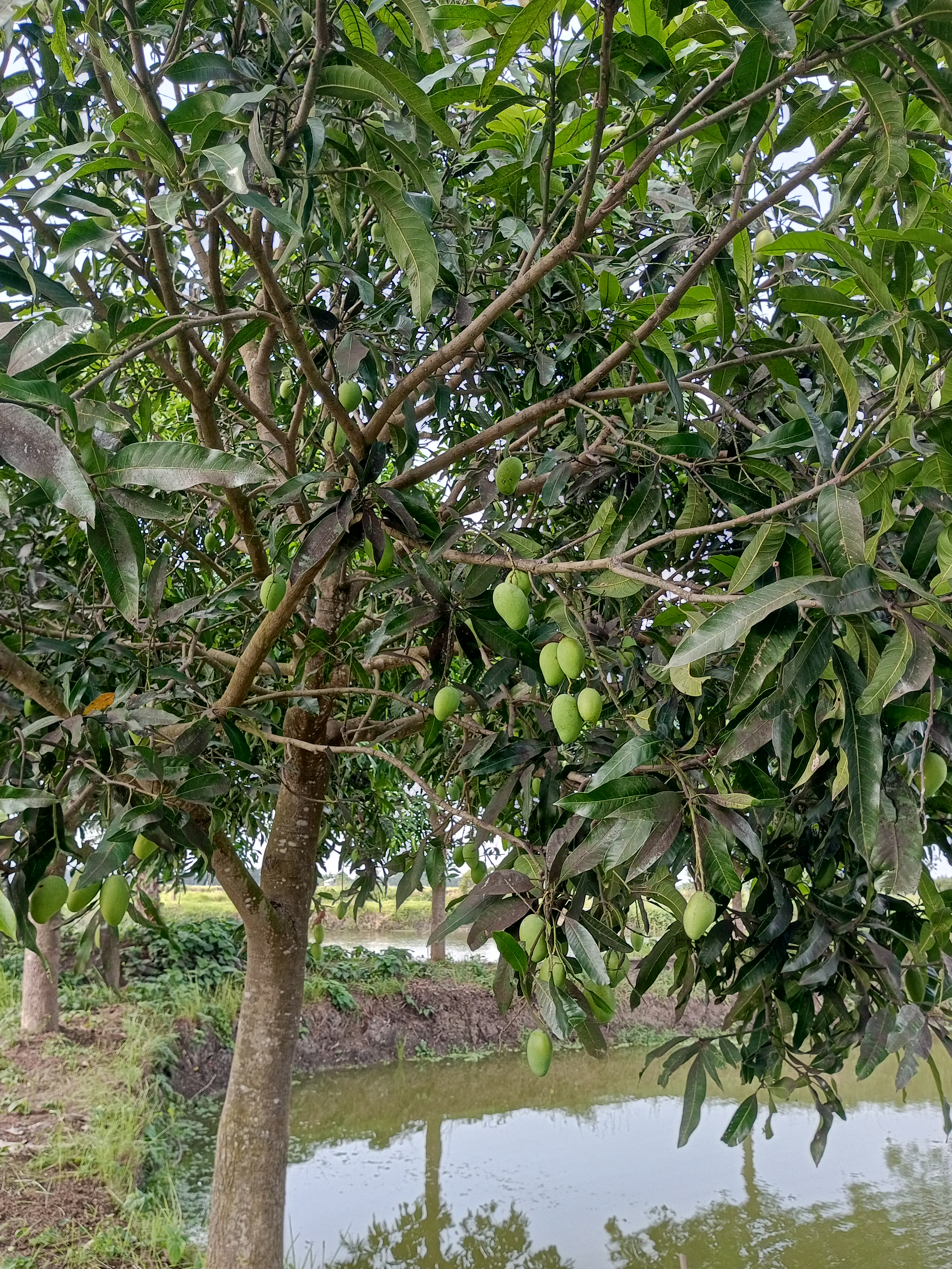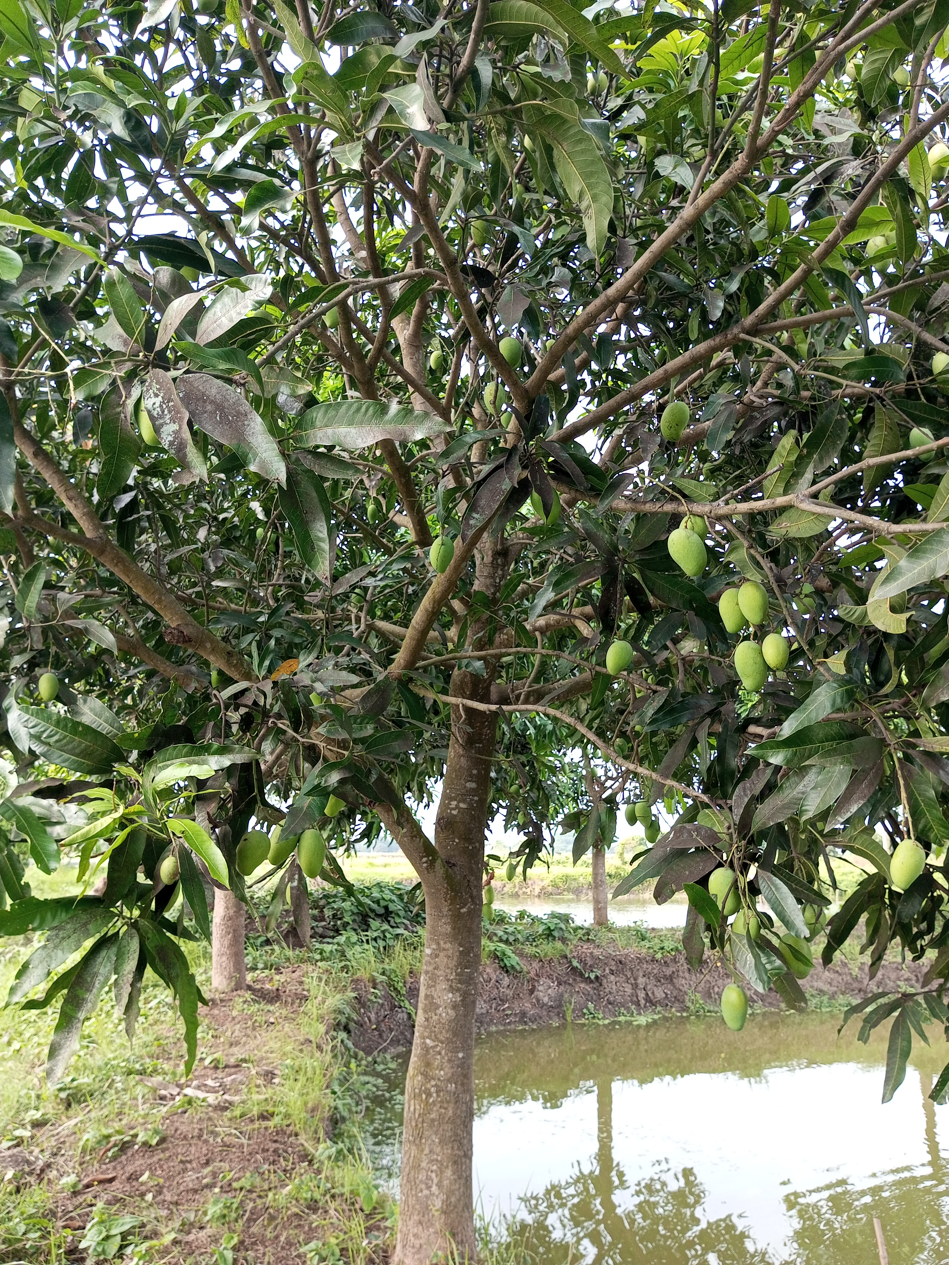 আম গাছগুলো সারিবদ্ধ ভাবে চার হাত পরপরে লাগানো। যার ফলে পুকুরপাড়ের সৌন্দর্য বৃদ্ধি পেয়েছে আরও বেশি।