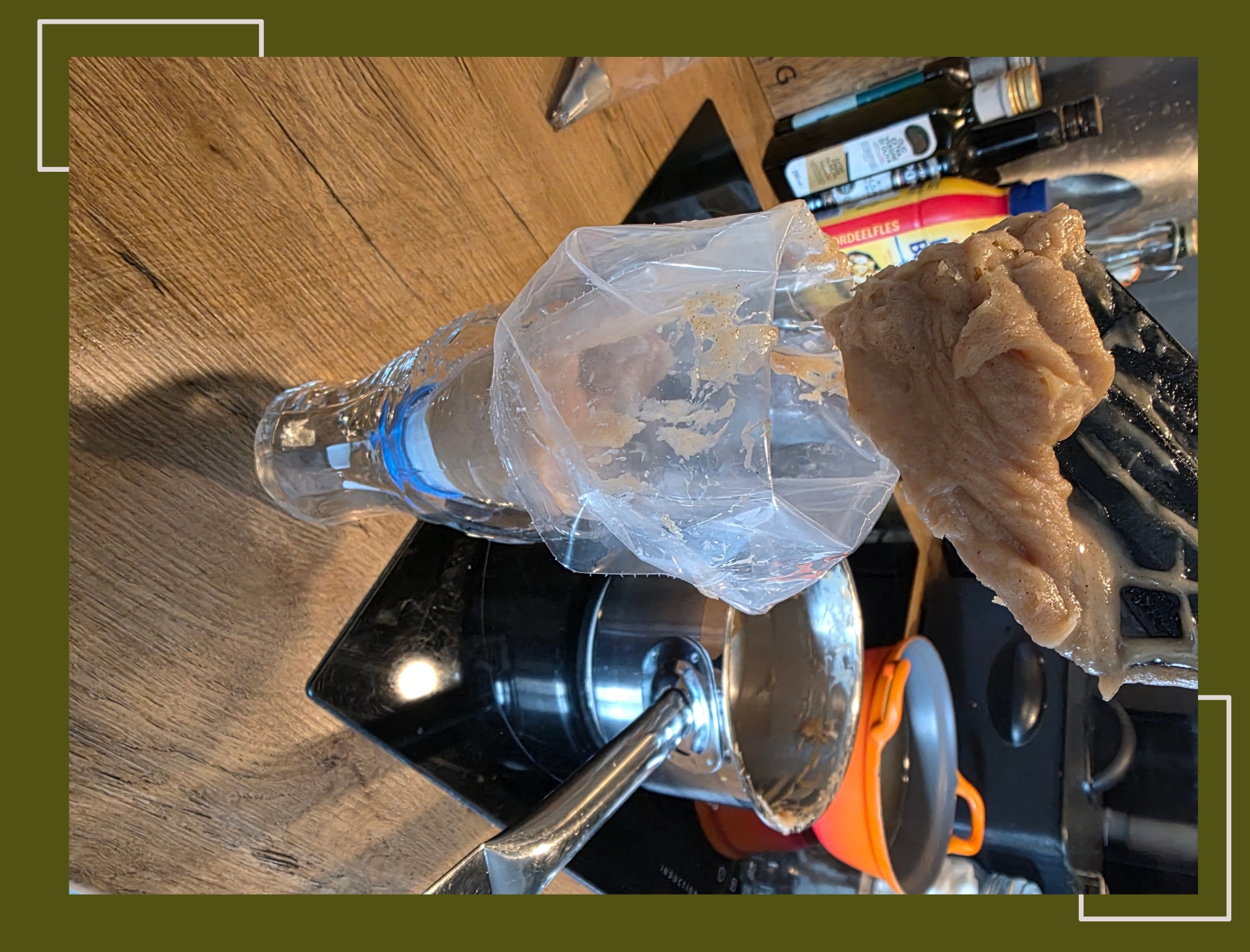 - Vul de spuitzak. Hierbij heb ik dankbaar gebruik gemaakt van een drinkglas waarin ik mijn spuitzak had gezet.