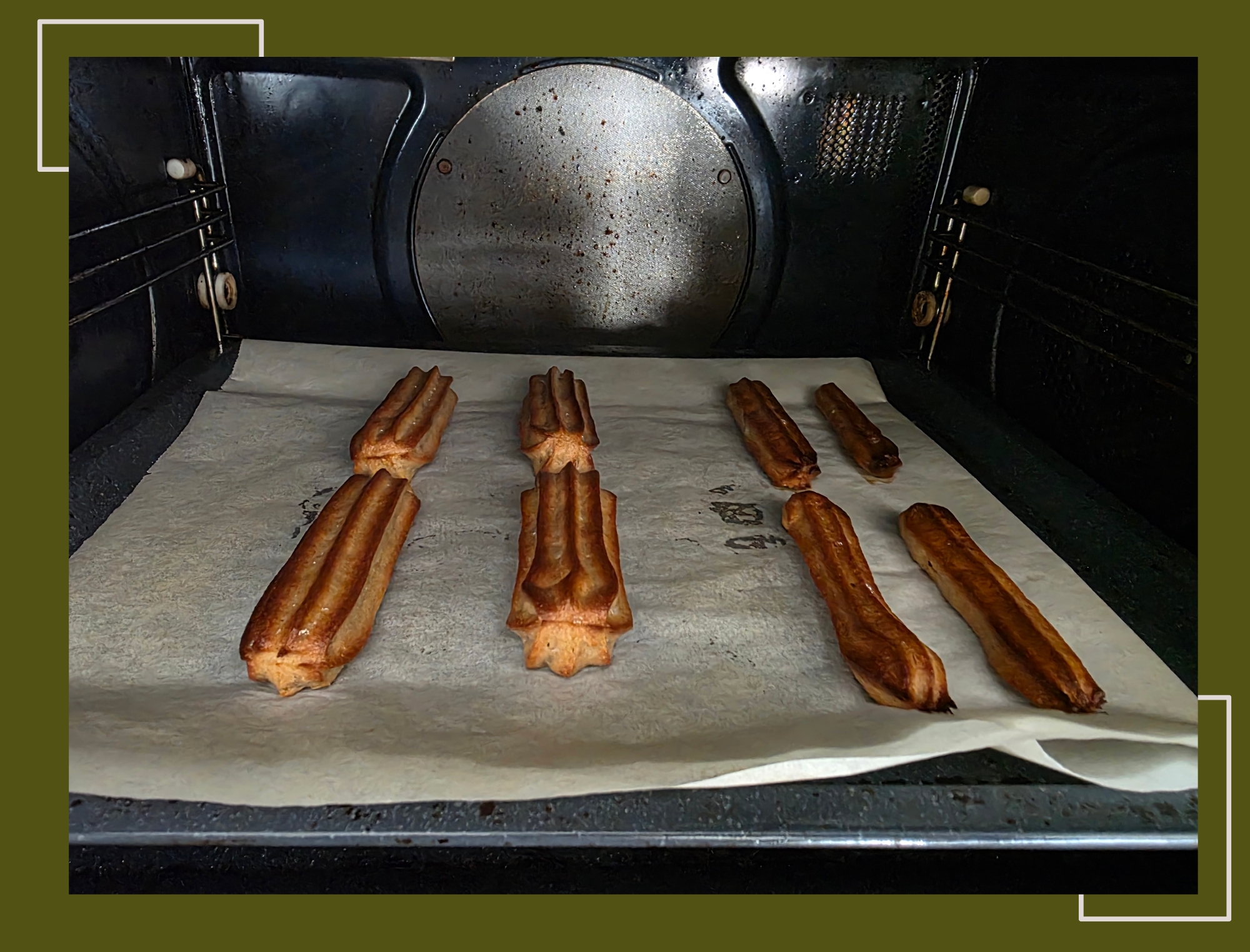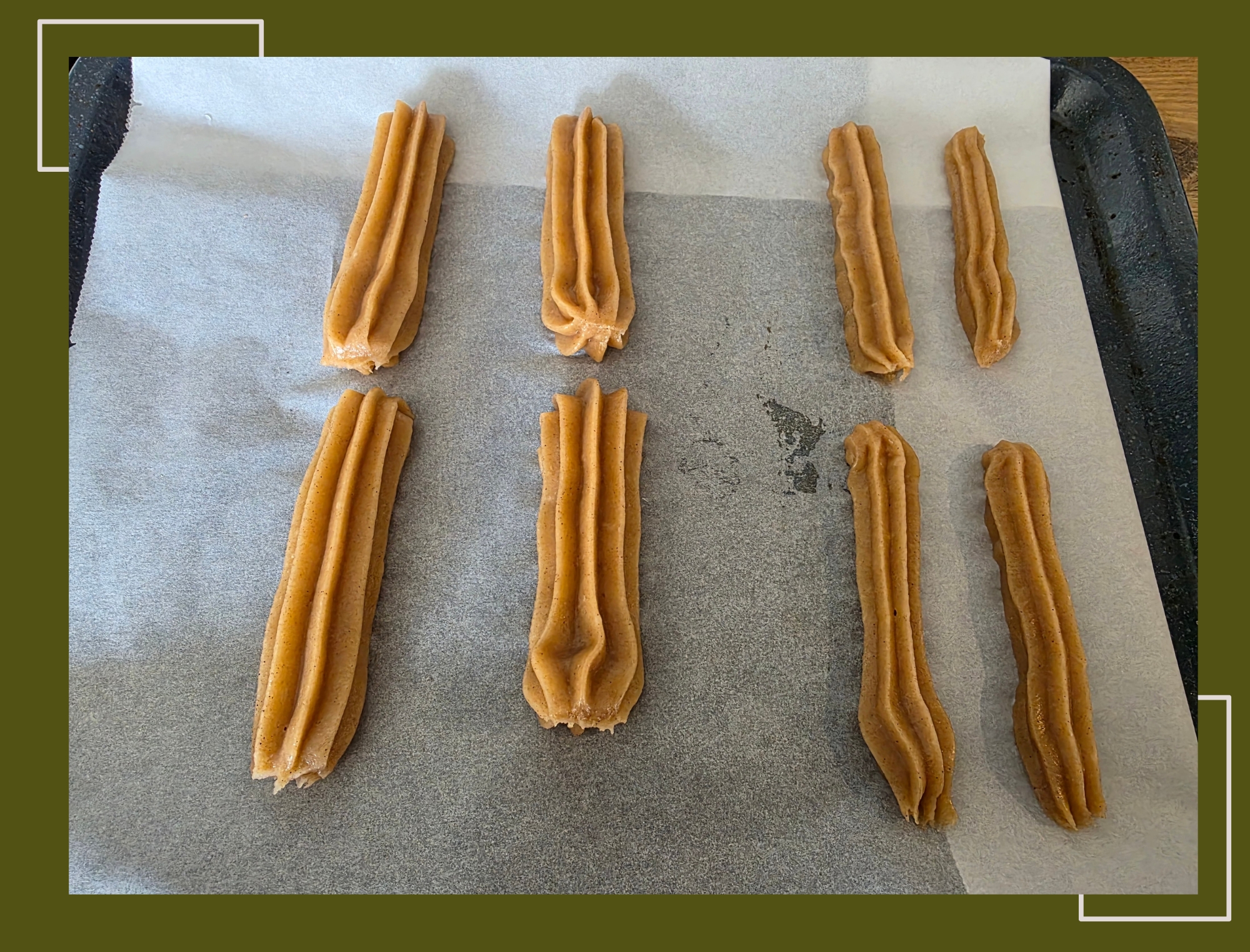 - De churros die in de oven klaargemaakt werden spoot ik op bakpapier op een bakplaat.