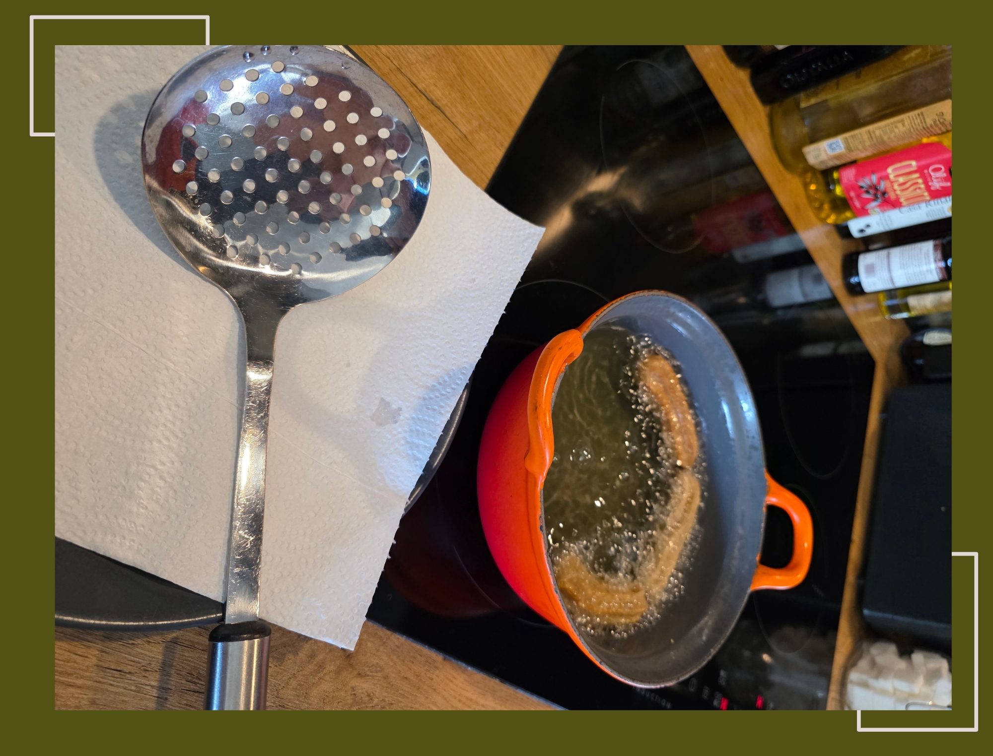 - Na 4 tot 5 minuten zijn de churros goud bruin en kun je ze uit de olie halen met een schuimspaan of tang.