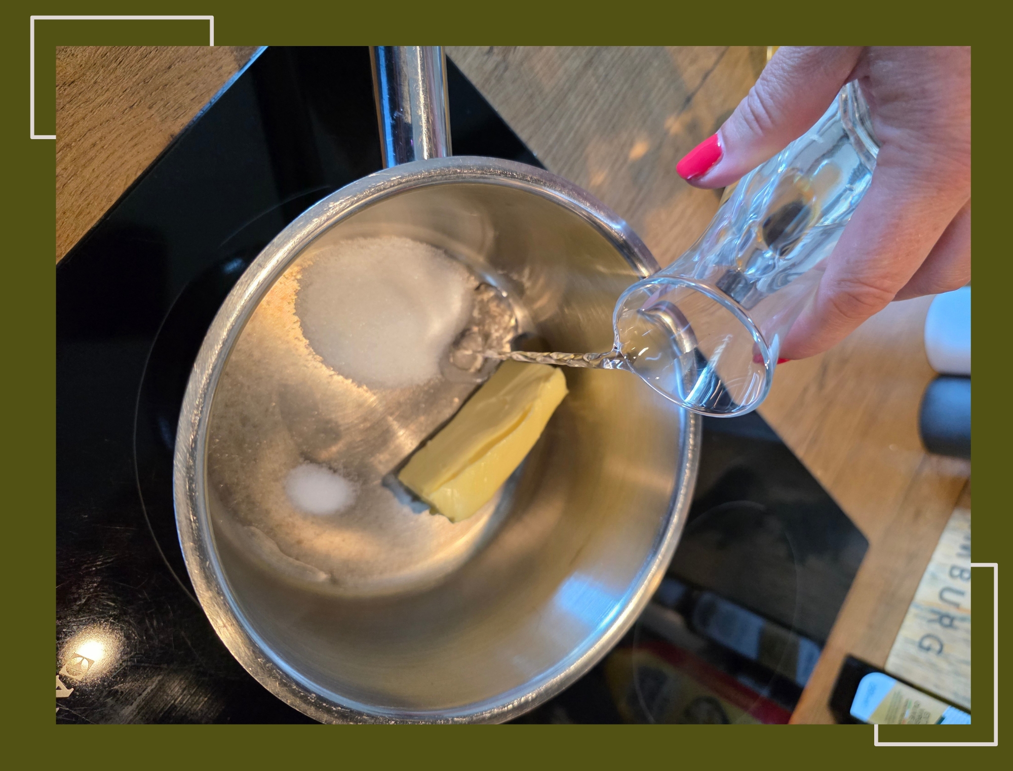 Suiker, boter, zout en water en verwarm je dit op een matig vuur.