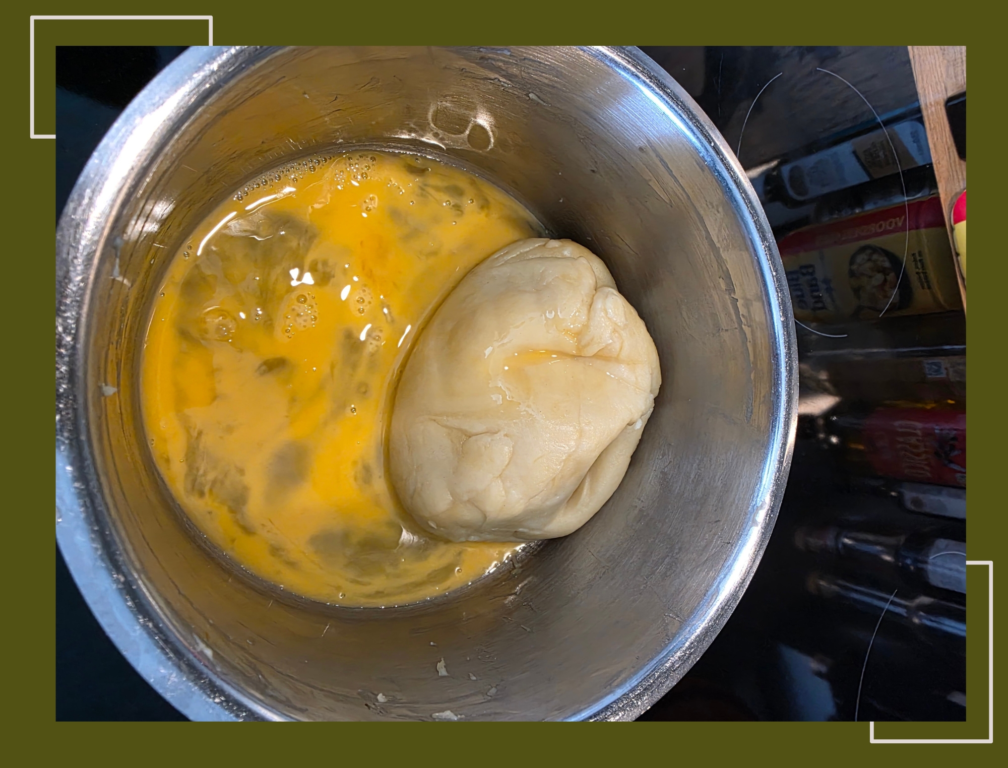 - Voeg ⅓ van dit eiermengsel aan je bol deeg toe. Je zult zien dat het deeg nu weer iets dunner en slapper wordt.