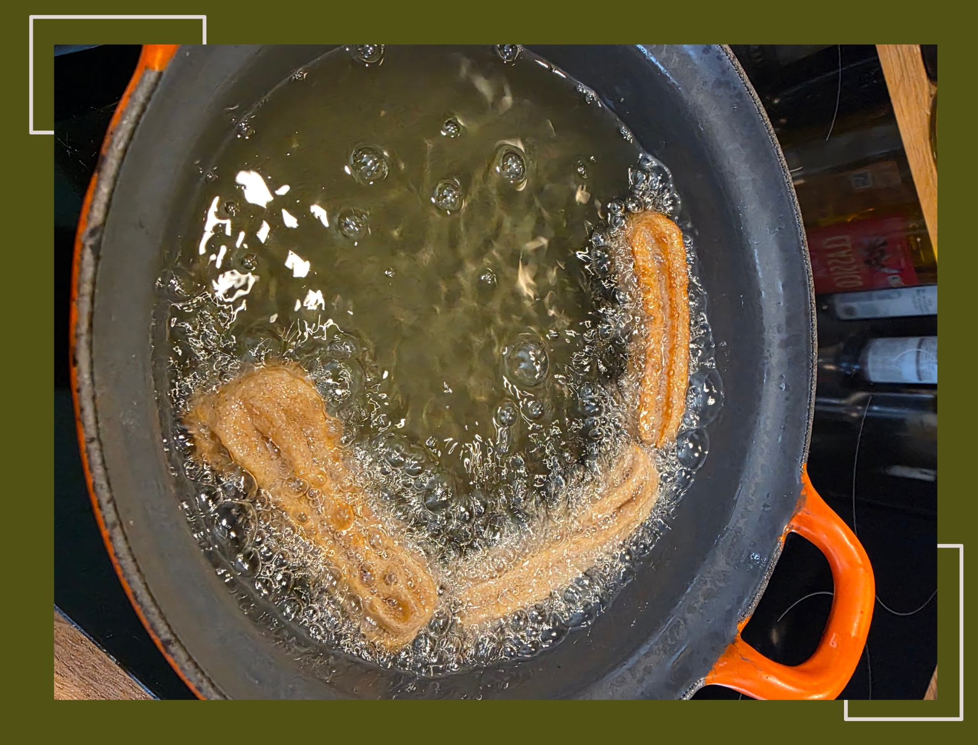- En terwijl de churros in de oven aan het bakken waren ( dit duurt 20 minuten op 200 graden celcius) bakte ik de churros in de zonnebloemolie in het pannetje.