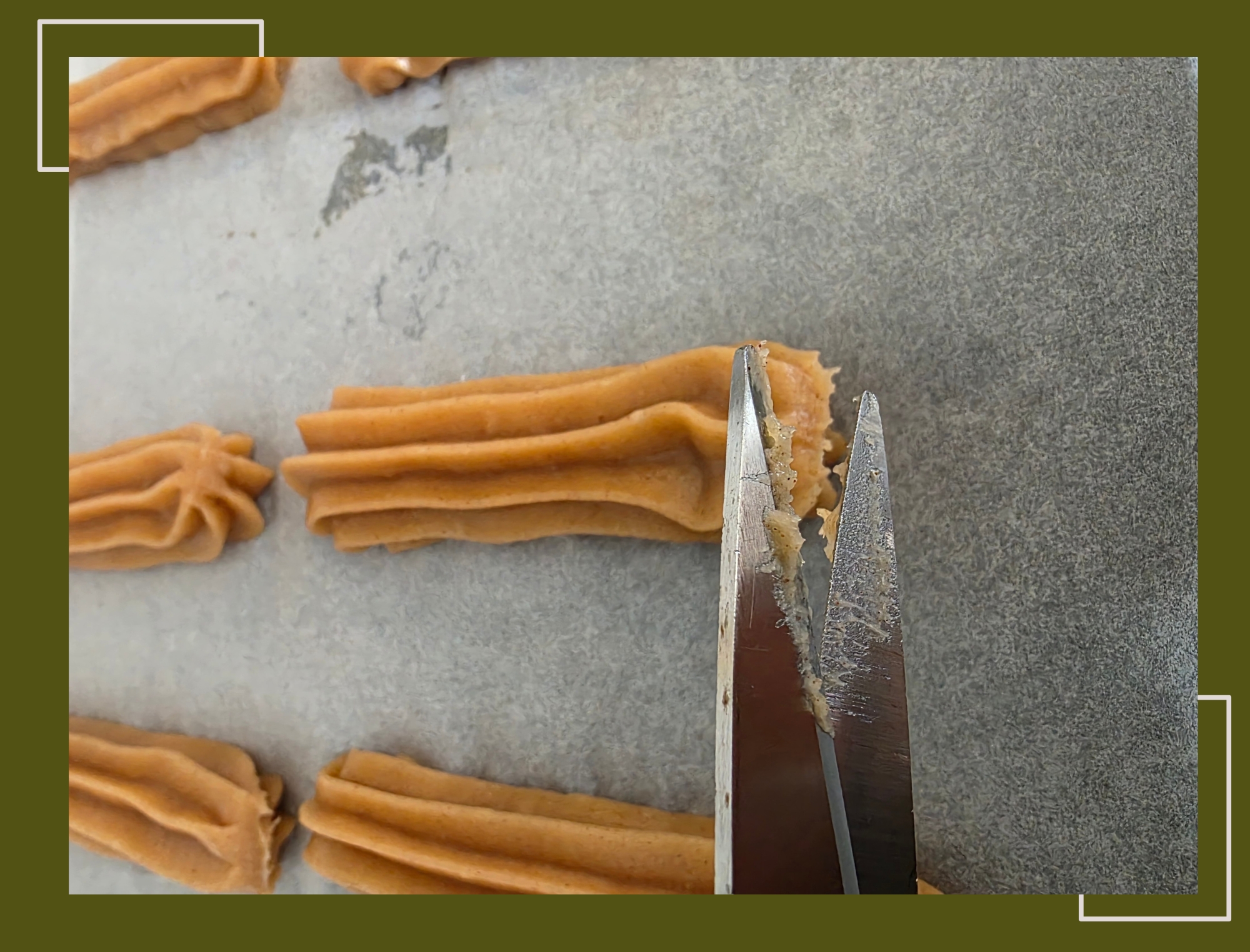 - D.m.v. een schaar die ik uitsluitend gebruik in de keuken, knipte ik het plakkerige deeg los van de spuitmond.