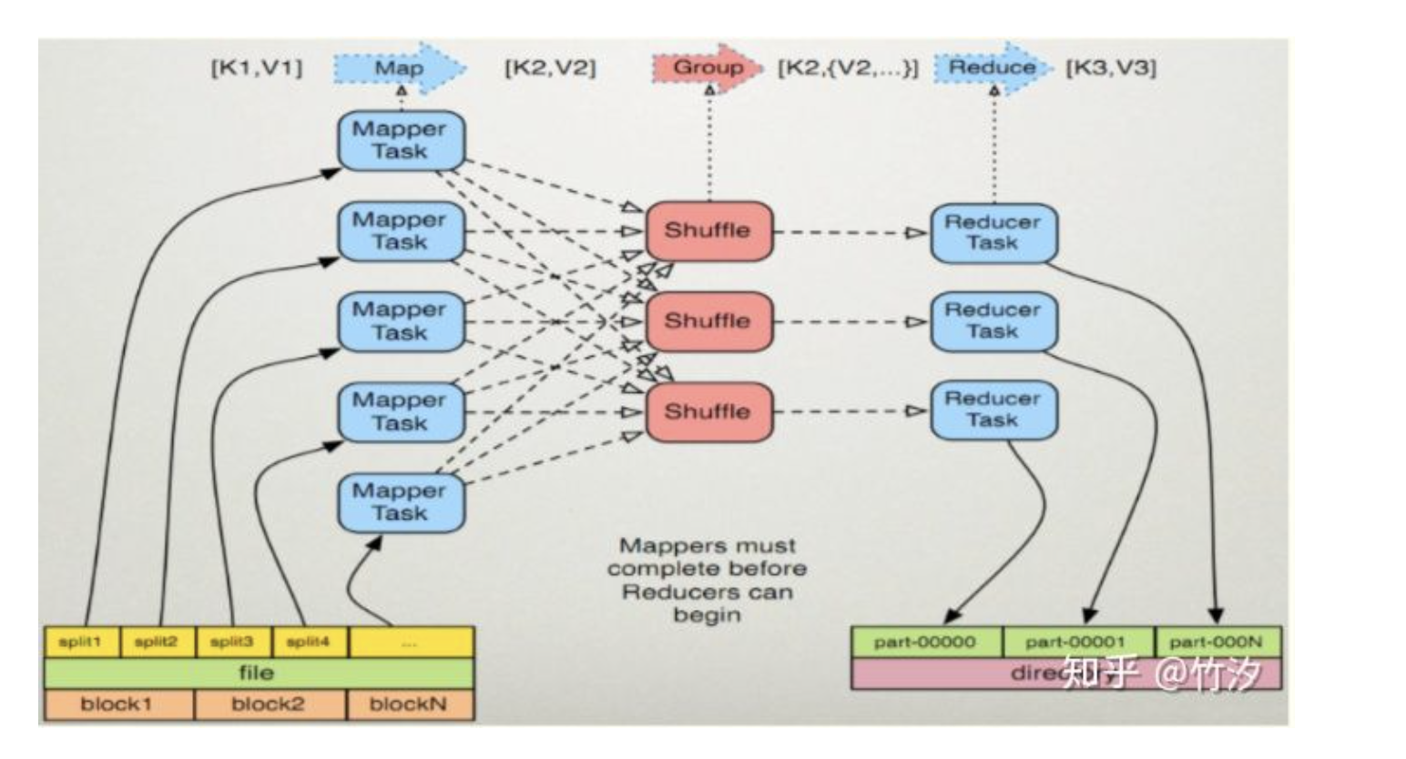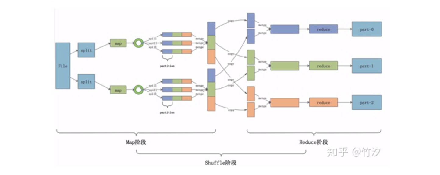 The Shuffle phase spans the Map side and the Reduce side, including the Spill process on the Map side, and the copy and merge/sort processes on the Reduce side. It is generally considered that the Shuffle stage is a process in which the output of the map is used as the input of the reduce.