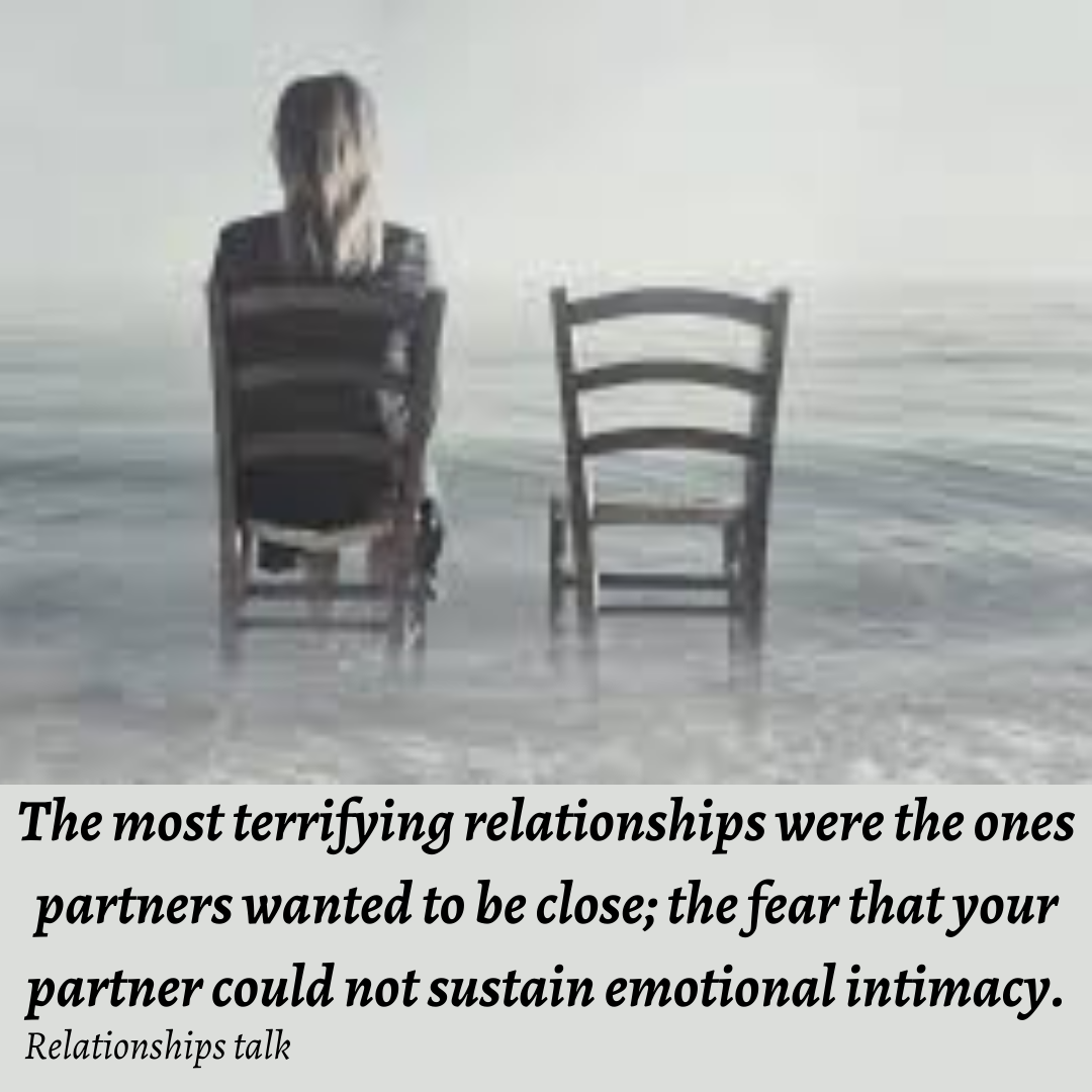Fearadokhai (37)in #matching2021 • 5 years ago The most terrifying relationships were the ones partners wanted to be close to; the fear that your partner could not sustain emotional intimacy. #romantic #relationshipmemes #wholesomememes #realtionship