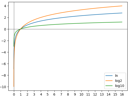 plt.legend(['ln','log2','log10'], loc = 'lower right')