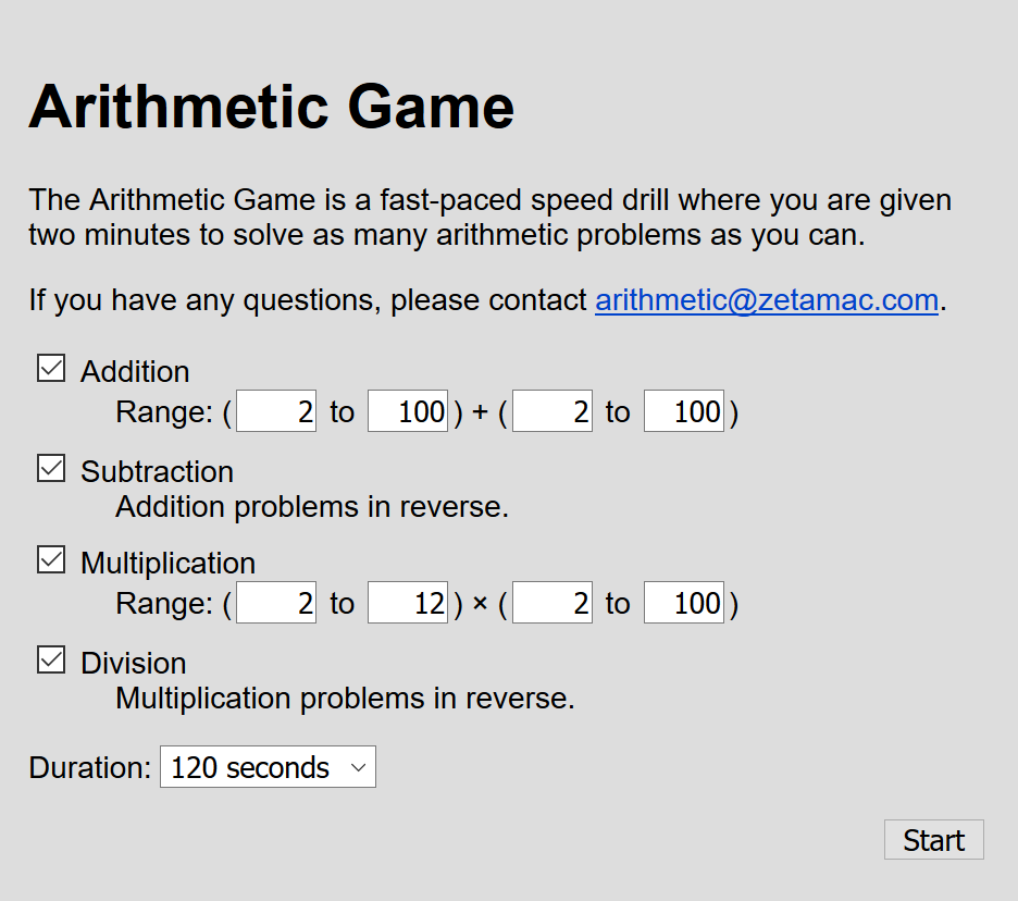 Here is another website for arithmetic practice. It includes a bit more advanced type of computations but nothing which would not be considered in the category of basic. I will probably give it a serious try once I get a more reasonable score on the arithmetic-zetamac game.