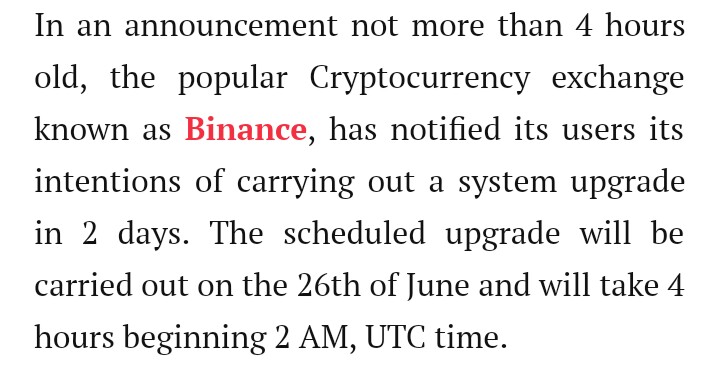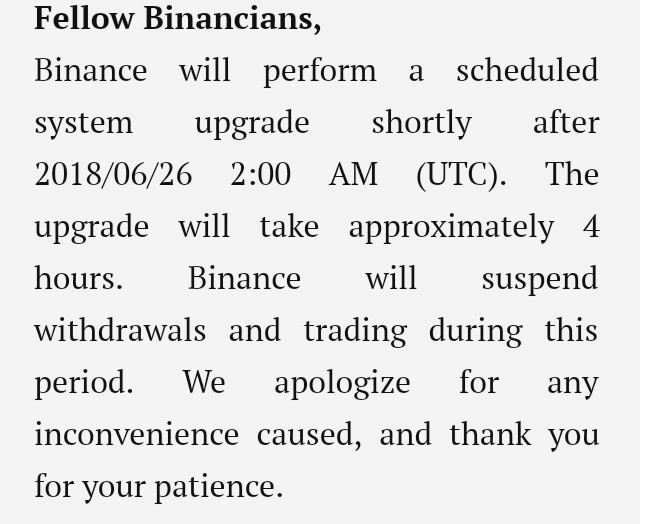 BINANCE ANNOUNCED SYSTEM UPGRADEsteemCreated with Sketch.pawanain (37)in #mdsc • 8 years ago #binance #news #crypto #bitcoin