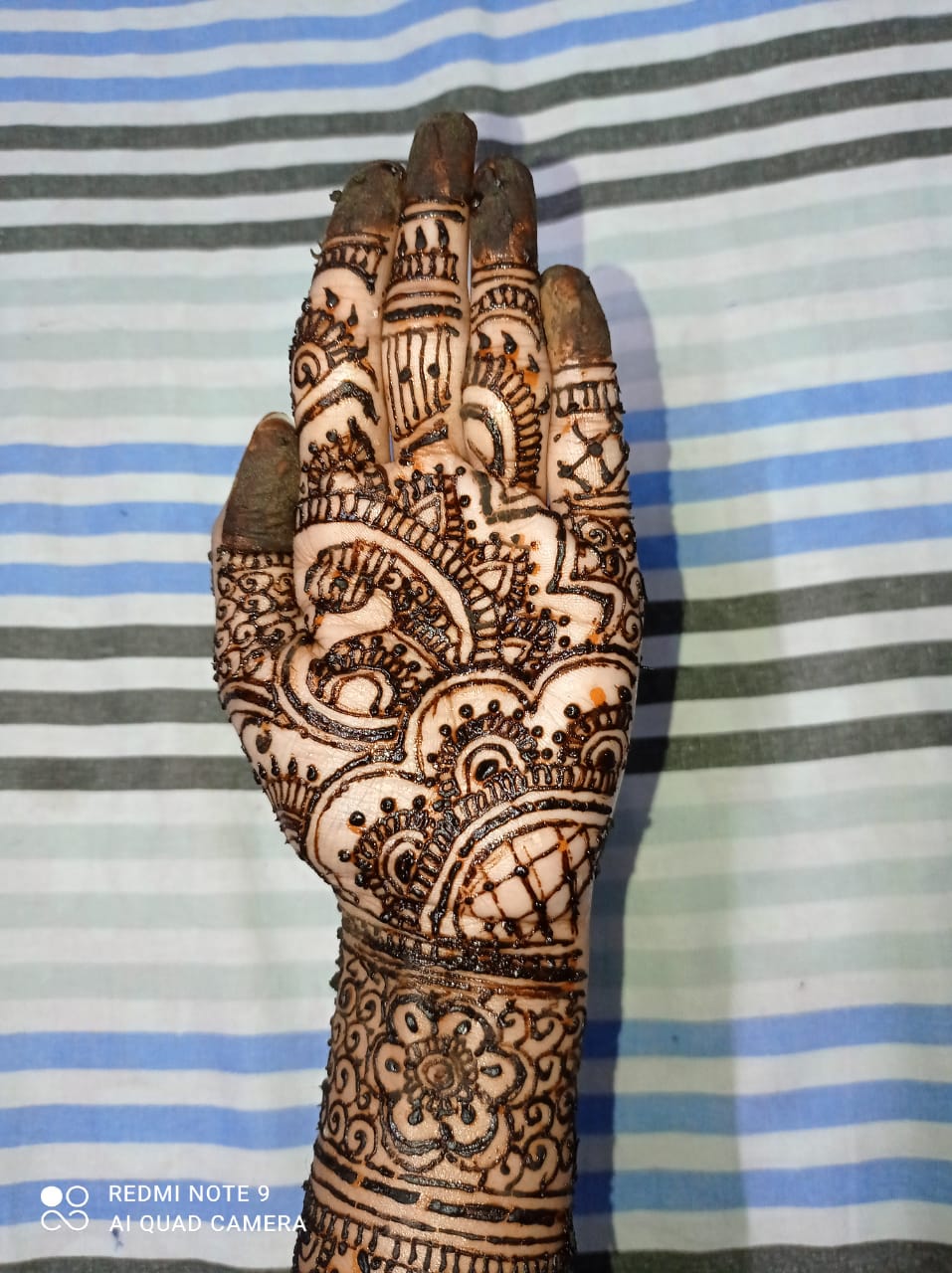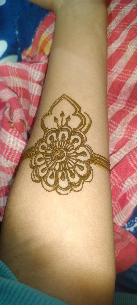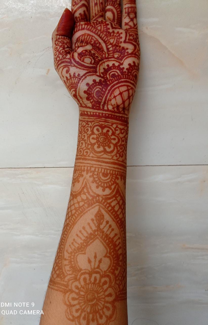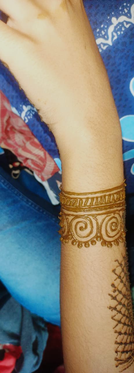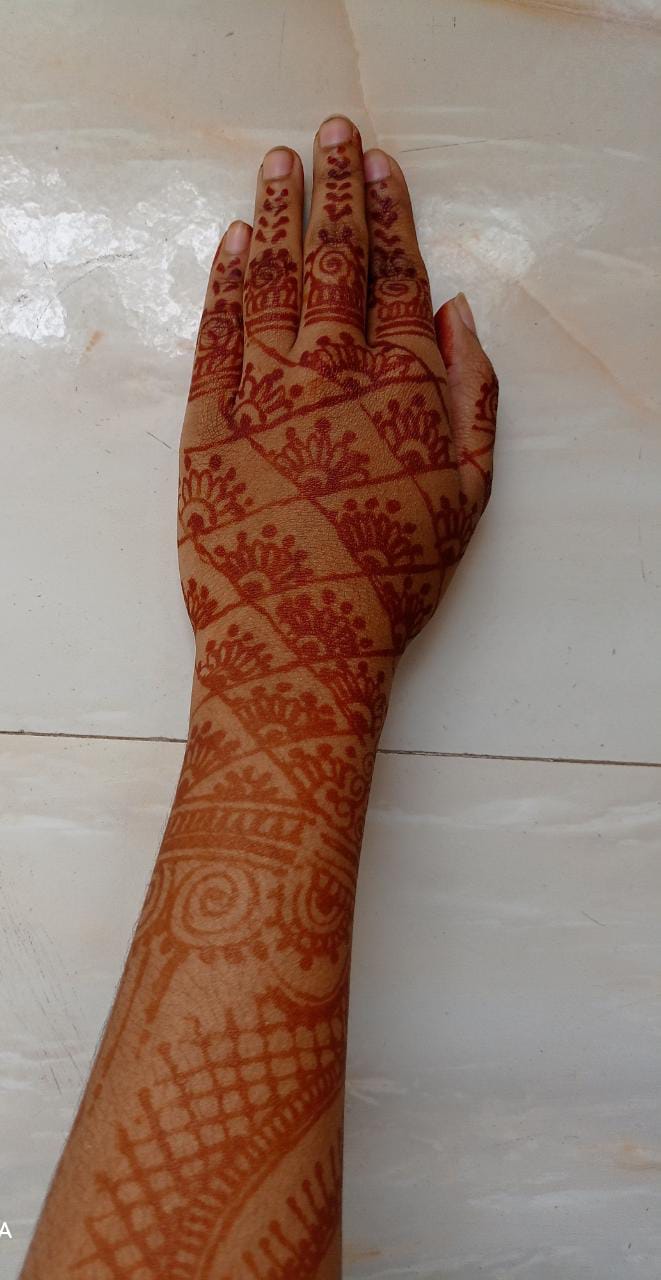 আমি মেহেন্দি পড়তে খুব ভালোবাসি।আর একটা কথা তো না বললেই নয় সেটা হলো আমার এক দিদির বিয়ে কালকে। দিদির বিয়ে বলে কথা আর আমি মেহেদি পড়বো না,তা তো হয় না।যাইহোক এত ব্যস্ততার মধ্যে আমার সময় কিভাবে চলে যাচ্ছে নিজেই বুঝতে পারছি না।একদিকে বিয়ে, আরেকদিকে কলেজের পরীক্ষা,আরেকদিকে প্রজেক্ট সাবমিট করা সব মিলিয়ে একেবারে ঘেটে আছি।কালকে বিকালে গেছিলাম মার্কেটিং করতে। যেগুলো কেনা বাকি ছিল সেগুলো কিনে এসে একটু ফ্রি হতেই মেহেন্দি পড়তে বসে গিয়েছিলাম।ঐজন্য বেশিক্ষণ মেহেন্দী হাতে রাখতে পারিনি তাও দেখলাম ভালই কালার উঠেছে🤭।