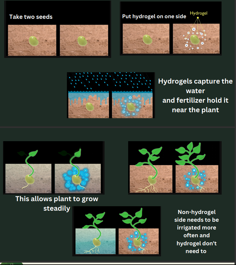 水凝膠技術可容納其體積500倍的水,使其成為優秀的節水產品。 它可以在土壤中儲存水分,減少侵蝕,提高產量,特別是在乾旱和半乾旱地區。 水凝膠還可用於減少除草劑和殺蟲劑的使用並改善肥料的釋放。