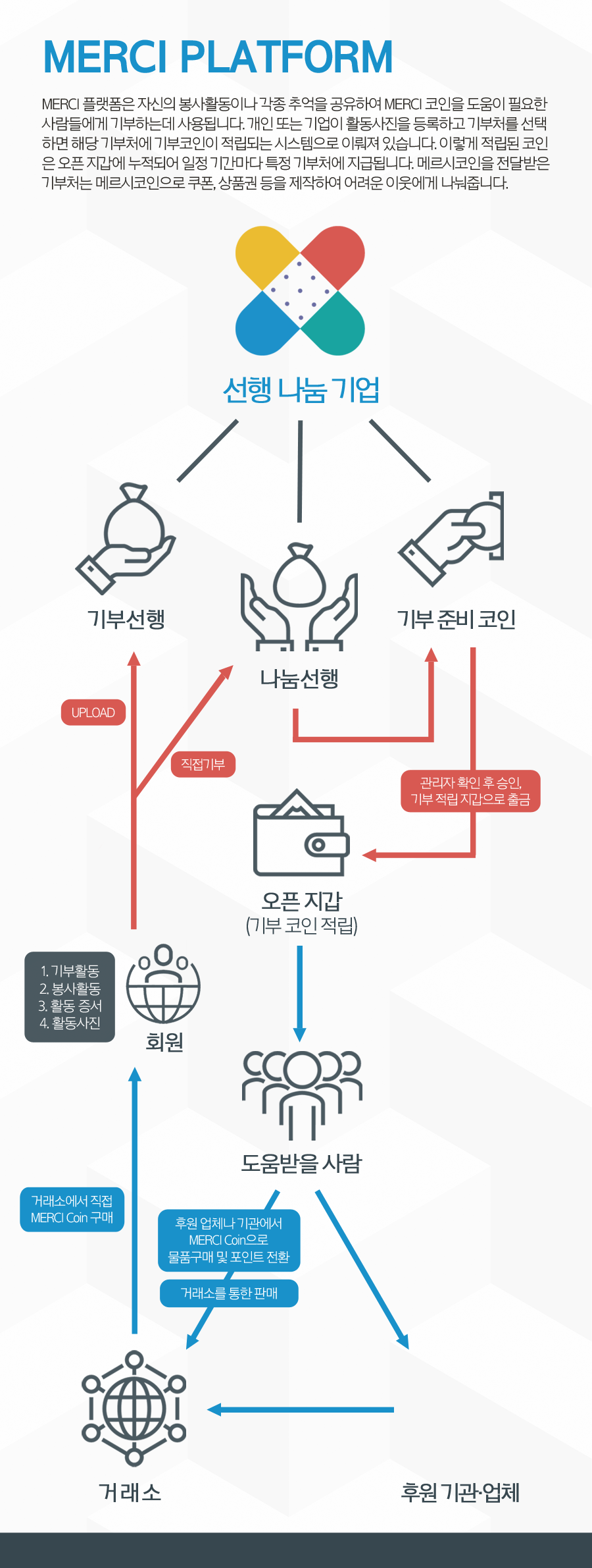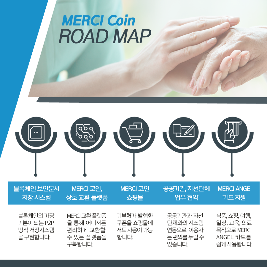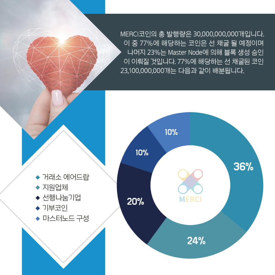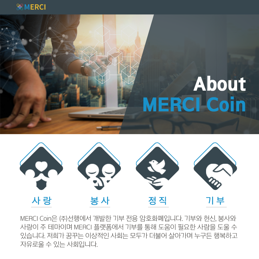 메르시코인은 블록체인 기술을 이용한 투명하고 공정한 기부 프로젝트를 꿈꾸고 있습니다. 메르시코인은 이를 위해서 비트코인의 UTXO 트랜잭션 모델을 사용하여 호환성을 증대시켰으며, 특정 권력자에게 집중되지 않고 분산화된 프로토콜 사용으로 보다 안전하고 신뢰 가능한 네트워크를 형성하였습니다. 또한 스마트컨트랙트를 기초로하여 이더리움의 실용성까지 구현과 함께 마스터노드에 의한 지분 증명 합의 프로토콜을 사용하였습니다.