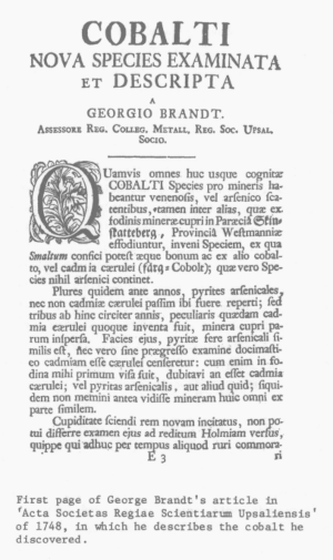 錬金術師はブラントの数世紀前にコバルトを製錬できたと考えられていますが、新しい金属を受け取ったことに気づいていませんでした。ブラント自身は、金属は「地球」(酸化物)と仮想物質のフロギストンとの化合物であり、燃焼プロセスにはフロギストンの放出が伴うと信じていました。わずか半世紀後、Lavoisierは酸素を発見し、テーブルを作成します。ここには、まだ自由な形で分離できなかった実際の元素を含む反応性金属の酸化物が含まれています。