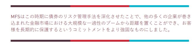 MFSはこの時期に債券のリスク管理手法を深化させたことで、他の多くの企業が巻き込まれた金融市場における大規模な一過性のブームから距離を置くことができ、お客様を長期的に保護するというコミットメントをより強固なものにしました。