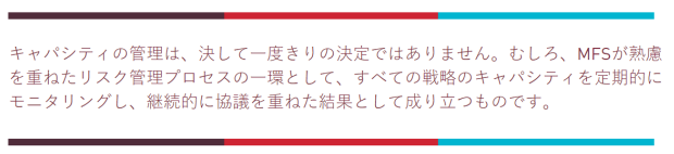 キャパシティの管理は、決して一度きりの意思決定ではありません。むしろ、MFSが熟慮を重ねたリスク管理プロセスの一環として、すべての戦略のキャパシティを定期的にモニタリングする継続的な協議の結果として成り立つものです。MFSのチーフ・インベストメント・リスク・オフィサーのJoe Flahertyは、「私たちはキャパシティの管理を重要なリスク管理の手段として位置づけており、投資家のリターンを守るため、ファンドの資金の受け入れを停止します」と述べています。
