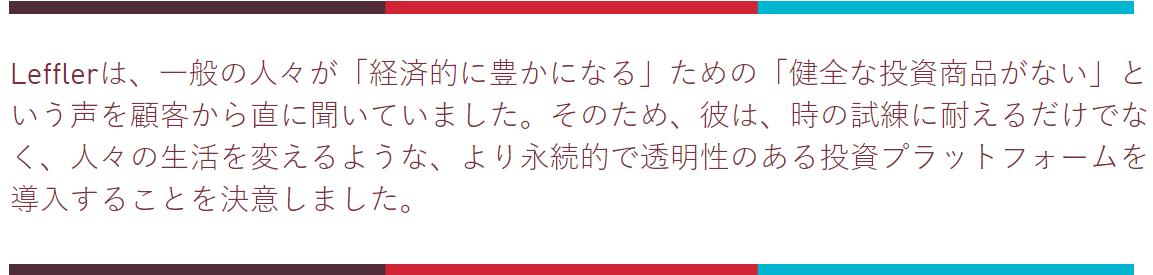 Lefflerは、個人向けに証券の販売に携わる中で、一般の人々が「経済的に豊かになる」ための「健全な投資商品がない」という声を顧客から直に聞いていました。そのため、彼は、時の試練に耐えるだけでなく、人々の生活を変えるような、より永続的で透明性のある投資プラットフォームを導入することを決意しました。