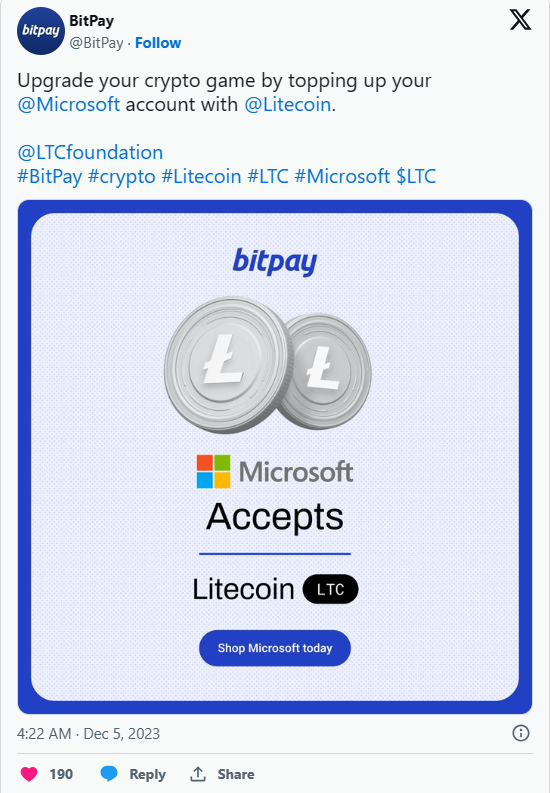 Microsoft and Litecoinmichael88 (27)in #microsoft • 2 years ago Microsoft products and services can now be paid for with Litecoin (LTC) - made possible by payment service provider BitPay. #litecoin #bitpay
