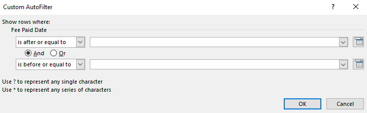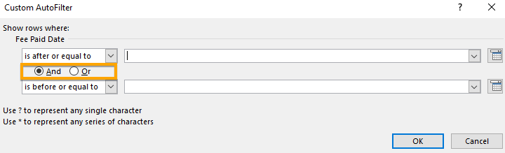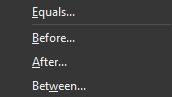 Filters which require more info from the user are Equals, Before, After, Between, or Custom Filters. After choosing them, a dialog box opens and prompts you for additional information such as Equals to, Before, or After a specific date or to create a Custom Filter.