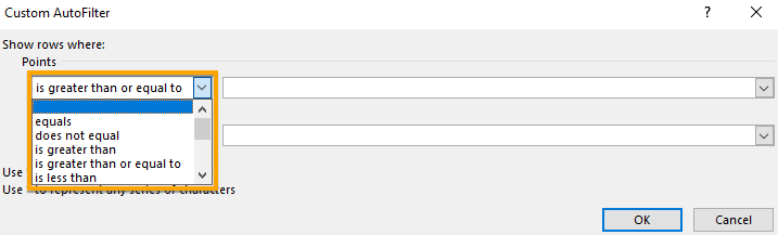 If you want to choose a different logical operator, Click the arrow on the right side of the Input box beside the Equals Input box and choose from the list. - Click OK after you set the desired logical operator and a value in the selection box.