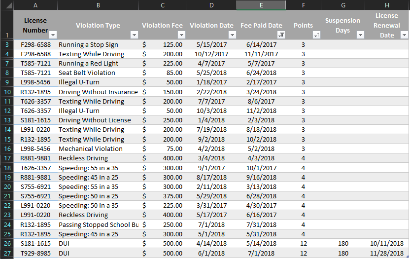 In a small dataset like this, it's easy to determine how many points each Florida driver has just by looking at the raw table. In reality, this dataset would likely have thousands of records and by using the filters, we can determine much quicker in an efficient way, how many and which drivers have Greater Than or Equal To 12 points.