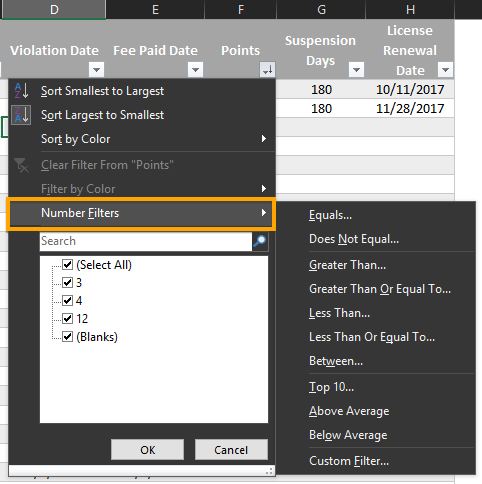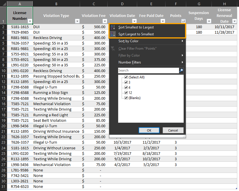 Access the Violations worksheet and click the arrow by the field column name "Points".