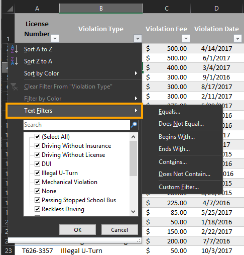 - Open the filter drop-down menu beside the field column called "Violations Types" and Scroll down to select "Text Filters". From the sub-menu that pops up, notice the Text filters that are available: Equals, Does Not Equal, Begins With, Ends With, Contains, Does Not Contain, and Custom Filter.