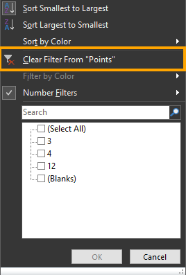 - To clear this filter and see all the records in the dataset, open the Sorting/Filters drop-down menu and click Clear Filter From "Points".