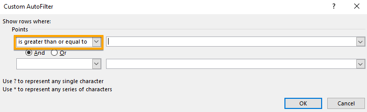 - When the Custom AutoFilter dialog box opens, notice the field name structure of the first input box; Show Rows Where > Points > Is greater than or equal to