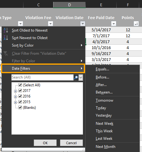 Click Clear Filter From Violation Date filters sub-menu.