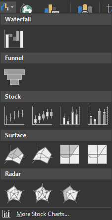 - Click the button on the ribbon which says insert Waterfall, Funnel, Stock, Surface, or Radar Chart.