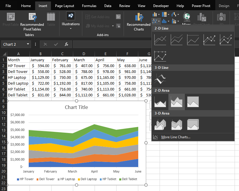 One of the more popular chart types is the line chart. They work well for visualizing trends across a time period or presenting categories when their order is necessary. Excel gives you a few options on how to display charts: