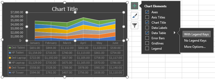 These choices vary depending on the chart type you use. Certain elements let you customize it even further. For example, if you want a legend, you can choose the location it where to display it on the chart.