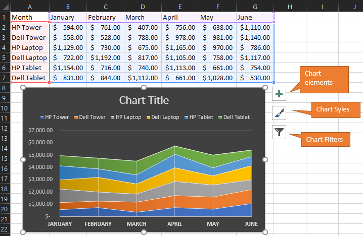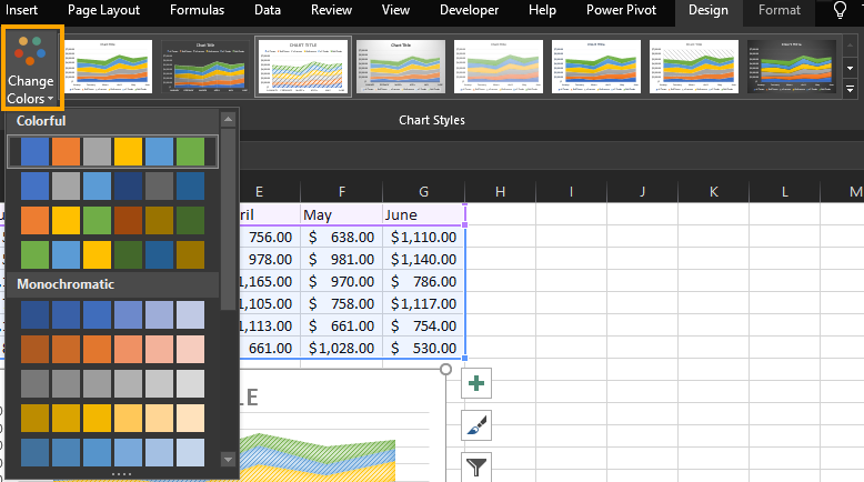 Here you can customize the look and feel of your chart in the same way as you would go to the Design tab > Chart Styles ribbon menu. Let’s give our chart a different feel.