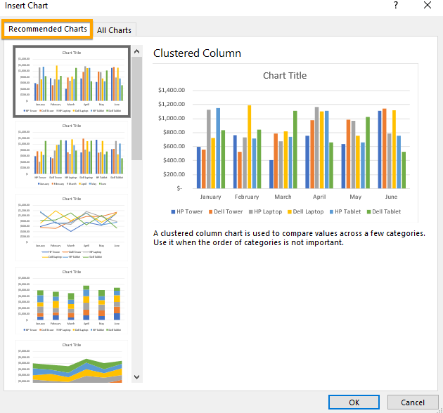 The mentioned charts in this article are certainly not the extent of what you can create in Excel. To see other recommended charts based on your dataset go to Insert tab > Recommended Charts button. You can browse the Recommended Charts list if you aren’t confident which chart type would best describe your dataset.