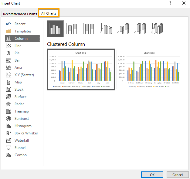 - The second option is to choose the Recommended Charts button to inspect the recommended chart types if you aren’t sure which one you want to use. Additionally, you can see all the available chart types, which can be helpful. If you decide to select one from there, click OK to insert into your spreadsheet.