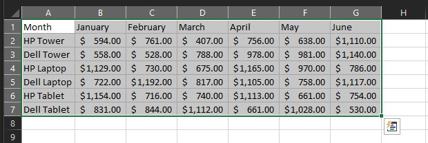 - Click the upper left cell, hold down the Shift key, and then click the bottom right cell.