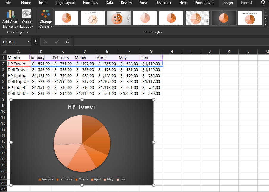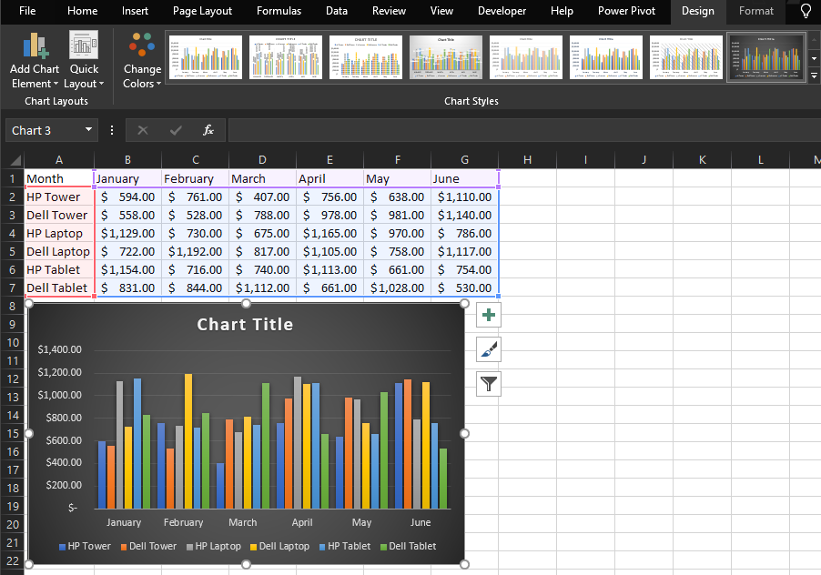 - Additionally, you can set a different pre-made design on your chosen chart type by going to the Design tab > Chart Styles